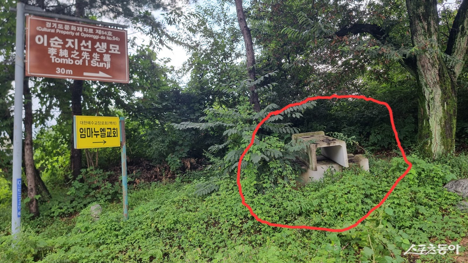 이뿐만이 아니다. 문화유산관리도 엉망이었다. ‘이순지 선생 묘’ 진입로 간판 옆에는 수년간 방치된 폐 배수 콘크리트가 볼썽사납게 있었고, 진입로는 도로가 파헤쳐져 사고 위험성이 높아 보였다. 또 묘지 진입로는 잡풀이 우거져 이용할 수 없을 정도였다.