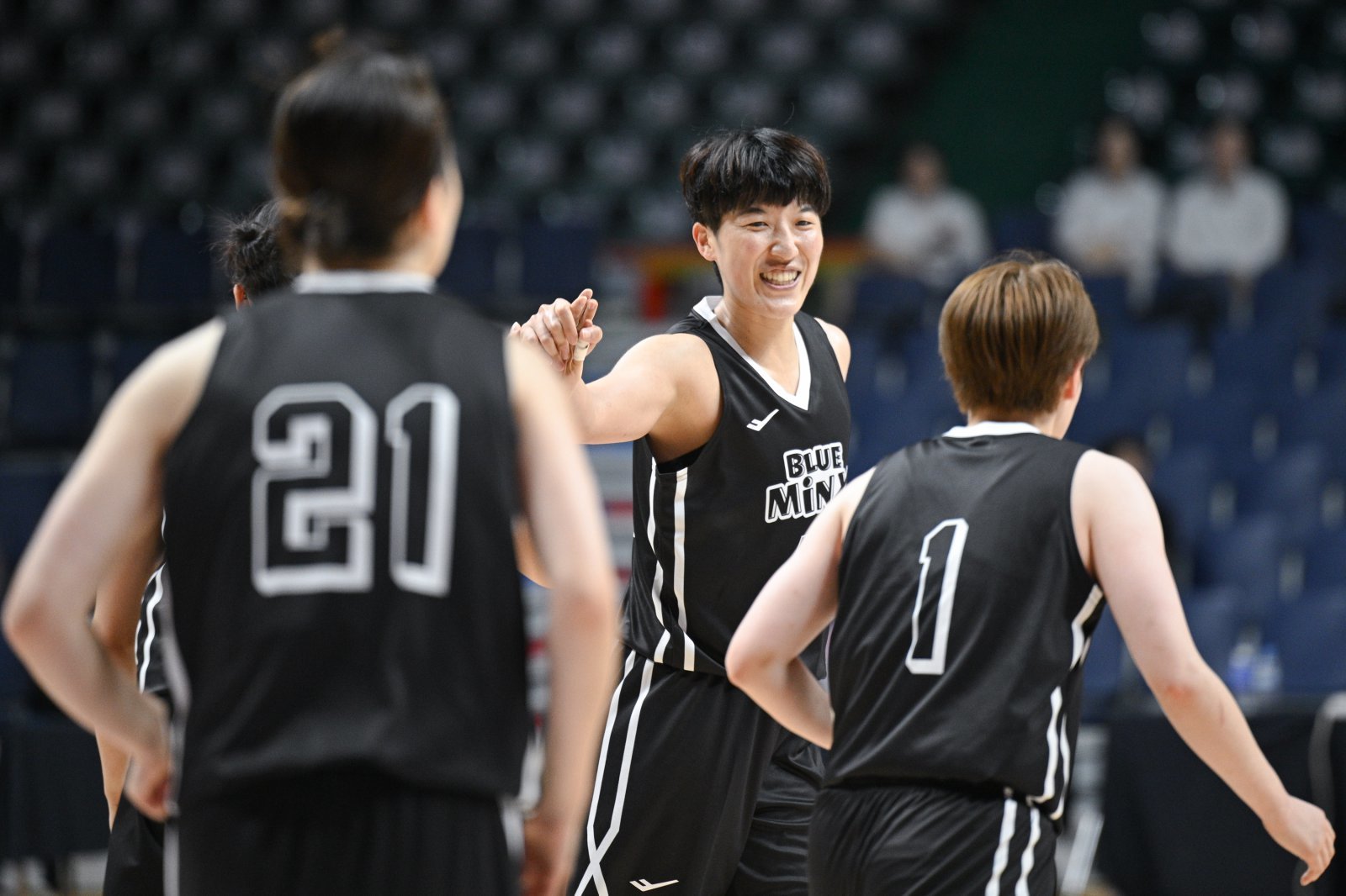 삼성생명 가와무라 미유키(가운데)가 1일 사직체육관에서 열린 후지쯔와 ‘2025 BNK금융 박신자컵’ A조 조별리그 2차전에서 24점을 폭발했지만, 팀은 57-68로 패했다. 동료들과 하이파이브를 하고 있는 가와무라. 사진제공|WKBL