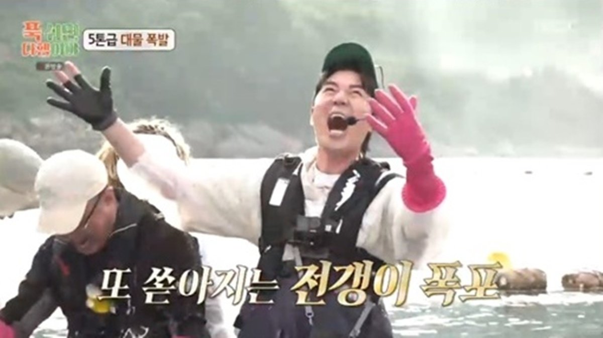 그물을 끌어 올리자 어마어마한 양의 생선이 등장해 모두를 놀라게 했다. 안정환도 “저 정도면 양탄자 아니냐”라고 감탄한 대광어부터 아나콘다급의 갯장어, 참돔, 돌돔, 꼬지, 고등어 등 수산시장급으로 다양한 어종이 잡혔다. 그중 하이라이트는 여름의 황제라 불리는 부시리였다. 거대한 사이즈의 부시리를 잡은 박건욱은 “만화에 나오는 바주카포 같았다”라며 크기에 감탄했다.
