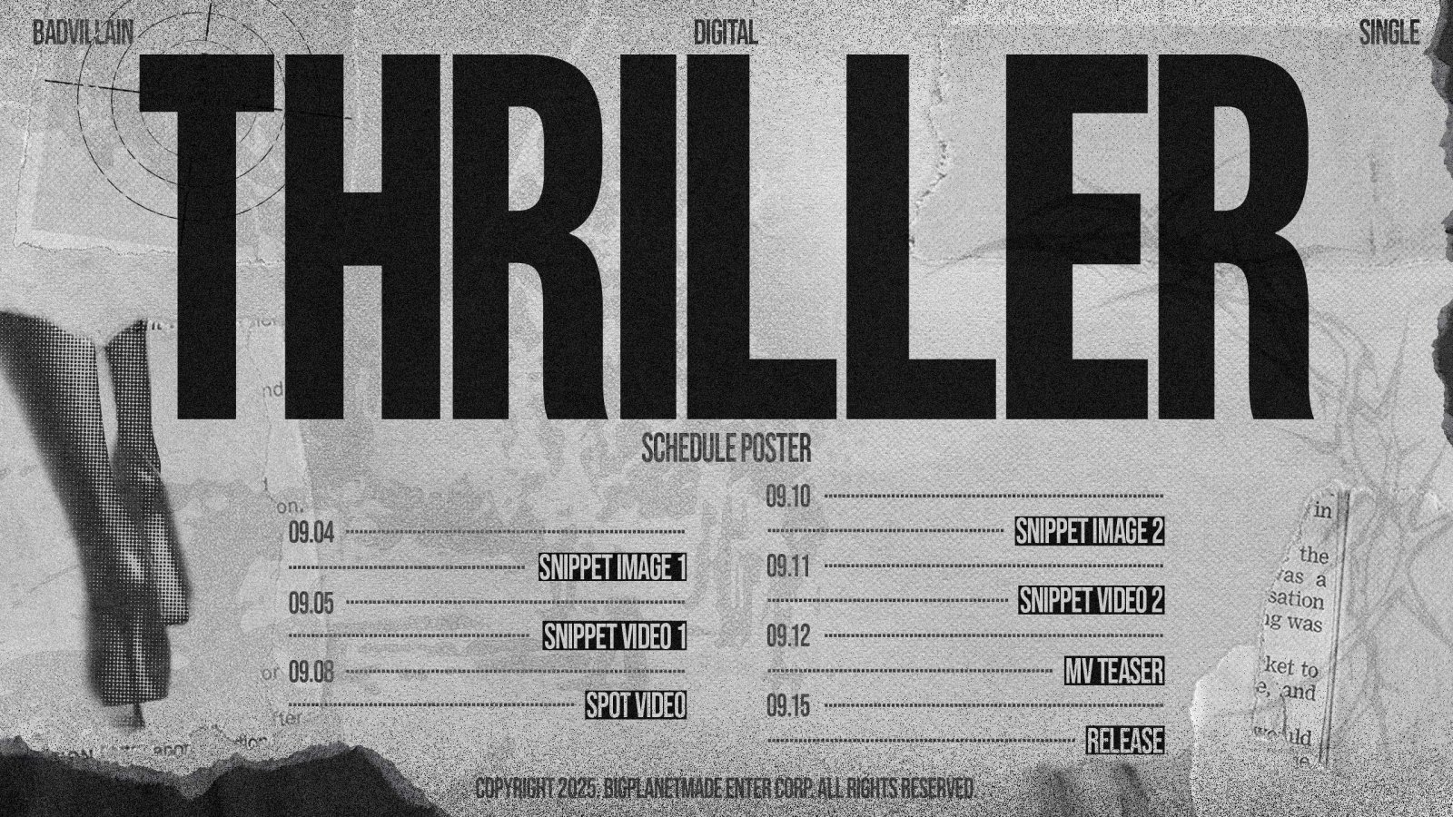 소속사 빅플래닛메이드엔터는 오늘(3일) 자정, 배드빌런(클로이 영, 켈리, 엠마, 빈, 윤서, 이나, 휴이)의 공식 채널을 통해 디지털 싱글 ‘THRILLER(스릴러)’의 스케줄 포스터를 게재했다.