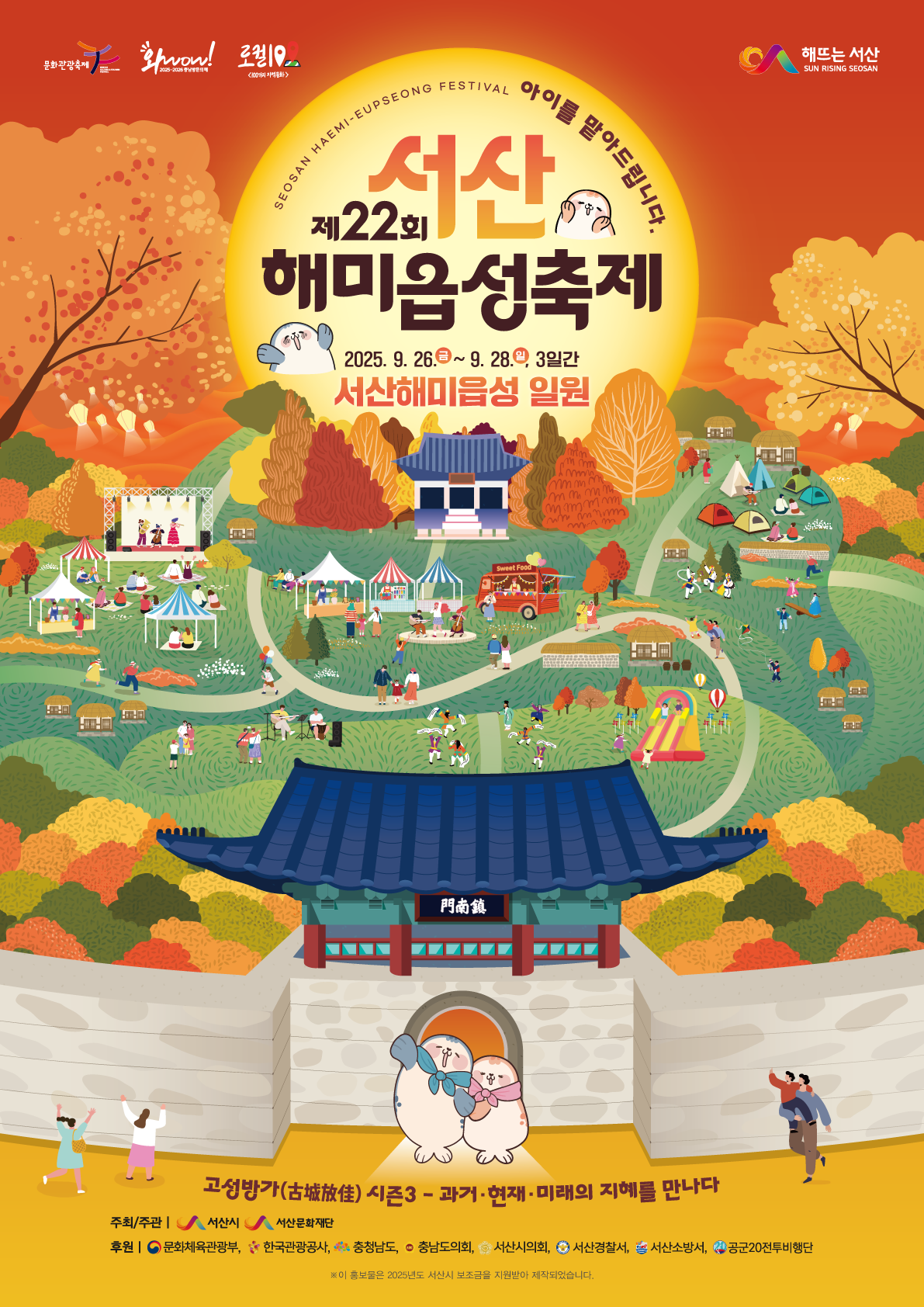 충청남도 서산의 대표 역사문화축제인 ‘제22회 서산해미읍성축제’가 9월 26일부터 28일까지 3일간 해미읍성 일원에서 개최된다. 서산시가 주최하고 (재)서산문화재단이 주관하며, 류재현 총감독이 기획을 맡았다.이번 축제는 ‘고성방가(古城放佳) 시즌3 – 과거·현재·미래의 지혜를 만나다’를 주제로 열린다. 지난해 방문객 27만 명, 경제효과 150억 원을 기록하며 충남 대표축제로 자리매김한 만큼, 올해도 전통과 첨단이 어우러진 무대와 가족 친화형 프로그램으로 풍성하게 꾸며졌다.