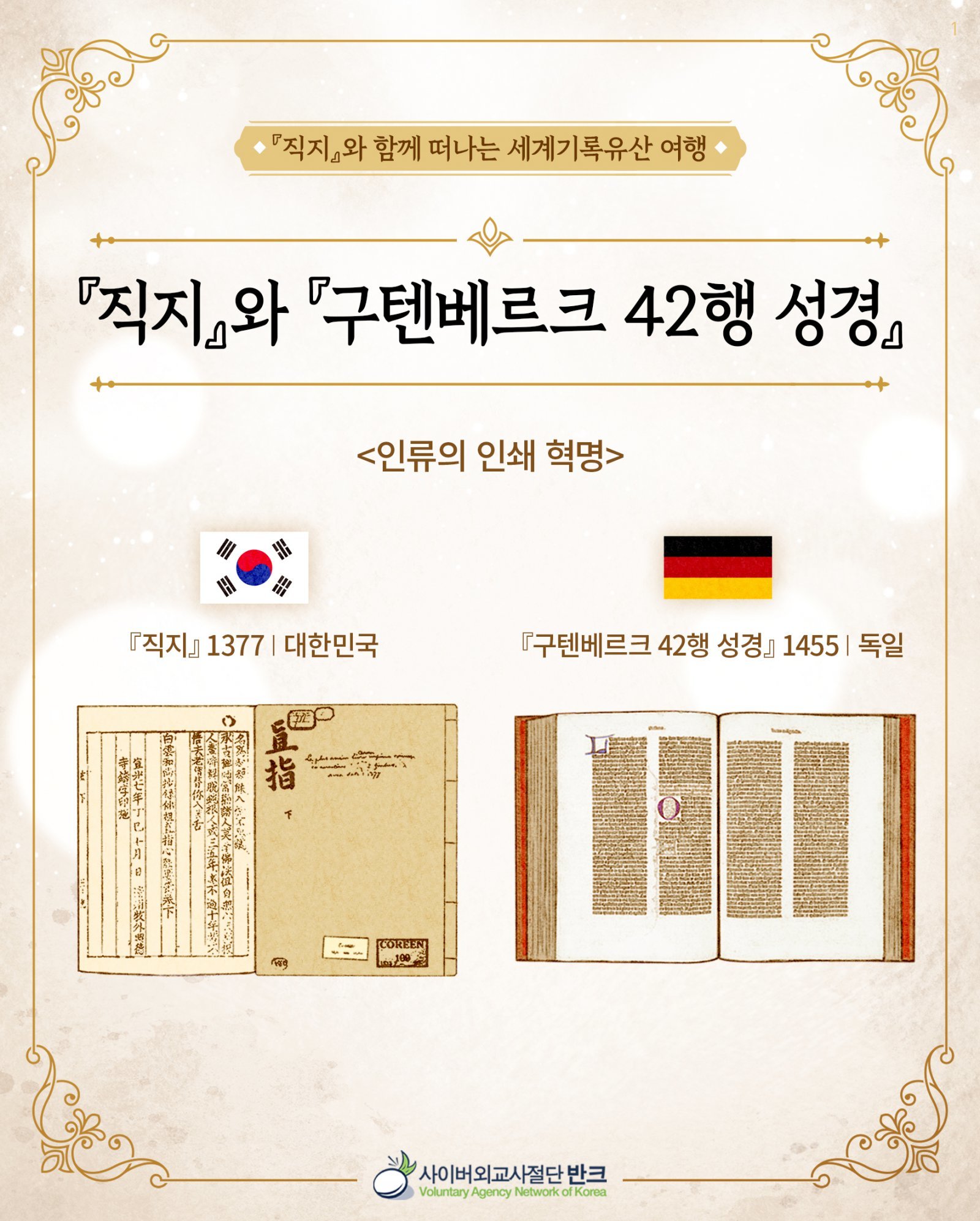 직지와 함께 떠나는 세계기록유산 여행 1편은 ‘직지’와 ‘구텐베르크 42행 성경’이다. 한국은 고대부터 인쇄술이 발달하여, 8세기 초에는 세계에서 가장 오래된 목판 인쇄본 ‘무구정광대다라니경’을 인쇄하였고, 11세기 초에는 ‘초조대장경’을, 13세기 초에는 ‘재조대장경’을 인쇄하였다. 이러한 인쇄문화는 더욱 발전하여 1377년 청주 흥덕사에서 금속활자로 ‘직지’를 인쇄했다.