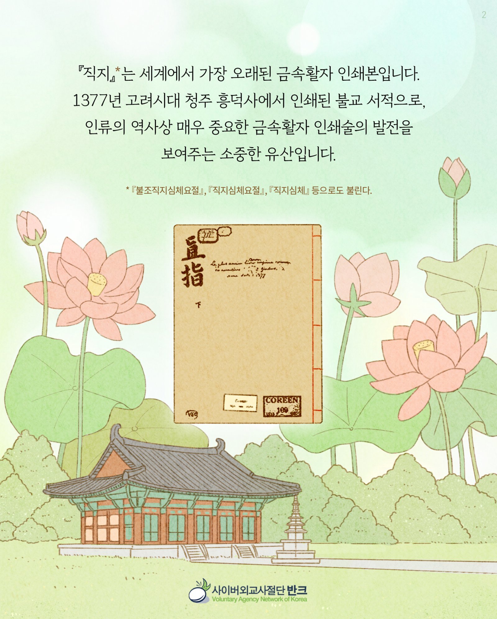 9월 4일은 ‘직지의 날’이다. 이날은 2001년 9월 4일 직지가 유네스코 세계기록유산으로 등재된 것을 기념해 제정된 날로 직지의 역사적·문화적 가치를 되새기는 상징적인 날이다. 이번 카드뉴스 시리즈는 ‘직지의 날’을 맞아 현존하는 세계에서 가장 오래된 금속활자본 직지의 가치를 기리고, 한국과 세계가 직지를 포함한 세계기록유산에 관심을 가지고 함께 지켜나가야 한다는 메시지를 담았다.