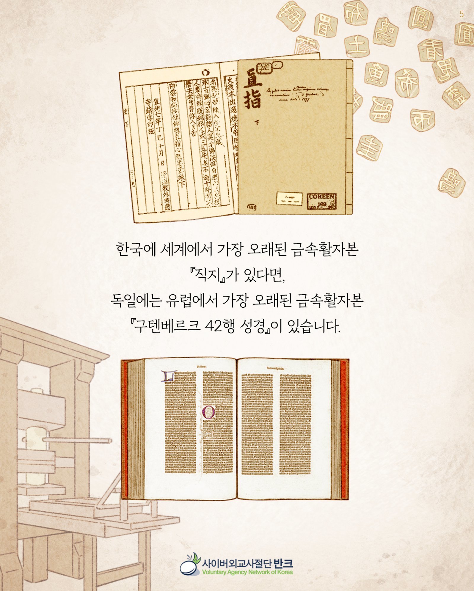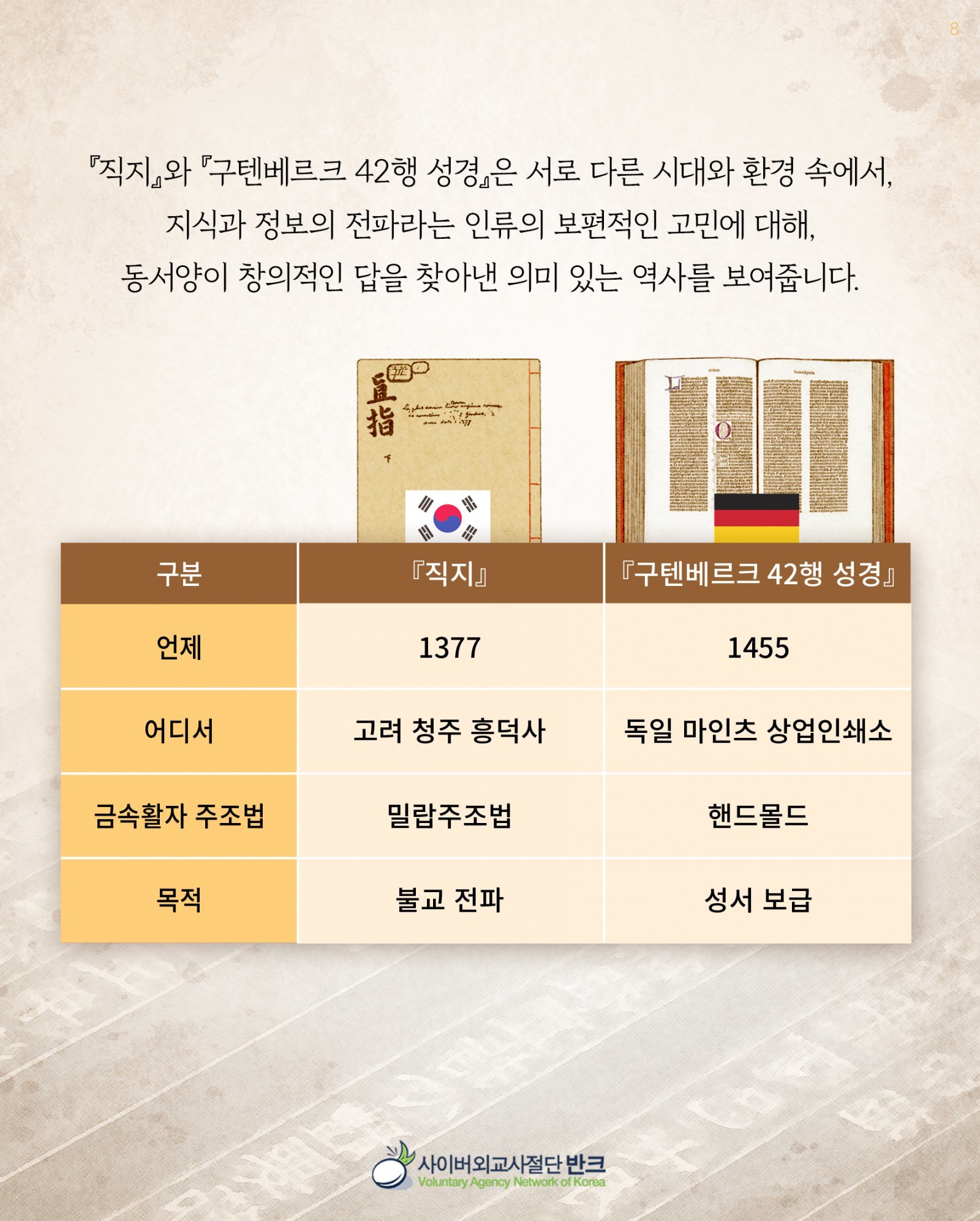 1377년 청주 흥덕사에서 인쇄된 ‘직지’와 1455년 독일 마인츠 인쇄소에서 인쇄된 ‘구텐베르크 42행 성경’은 시대와 환경은 달랐지만 지식과 정보의 전파라는 인류 보편의 과제 앞에서 동서양이 창의적으로 답을 찾아낸 의미 있는 역사를 보여준다.