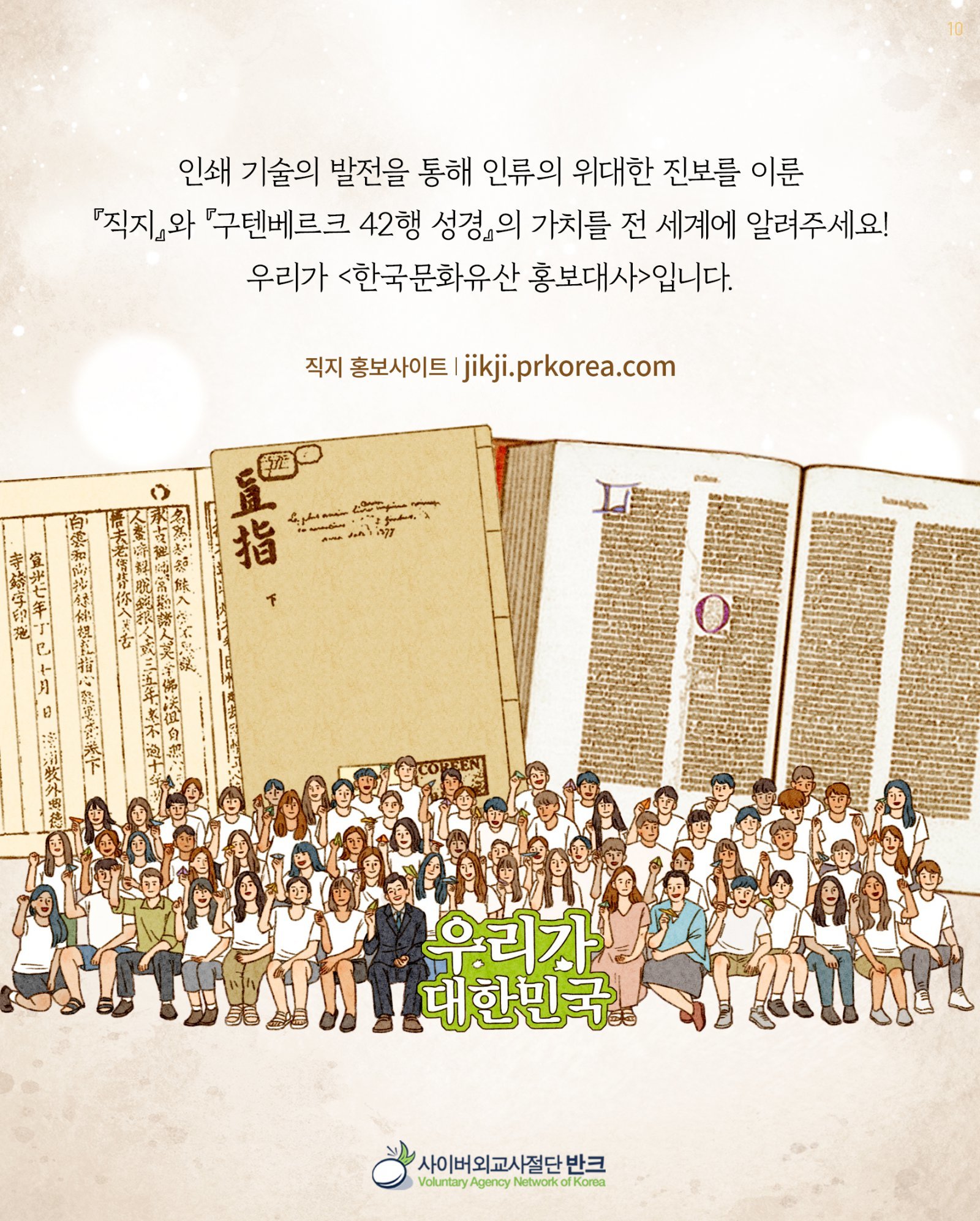 사이버외교사절단 반크는 2006년부터 청주고인쇄박물관과 협력하여 직지를 세계에 알리는 다양한 활동을 추진하며, 관련 콘텐츠를 제작해왔다. 이번에 제작한 직지 글로벌 홍보 카드뉴스는 반크 플리커, 인스타그램 계정에서 누구나 내려받아 활용할 수 있다.