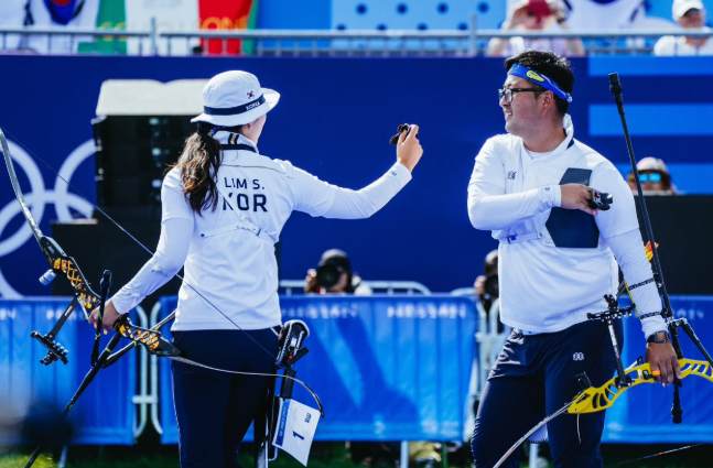 2025세계양궁선수권대회가 5일부터 광주에서 열린다. 국내에서 3번째로 열리는 세계선수권에서 한국은 리커브 전 종목 석권과 컴파운드에서 높은 국제경쟁력 확인을 목표로 삼았다. 사진은 리커브 3관왕(남녀개인전·단체전·혼성단체전) 후보로 지목된 김우진(오른쪽)과 임시현이 지난해 8월 2024파리올림픽에서 혼성단체전 우승을 합작하는 모습. 사진제공│대한양궁협회