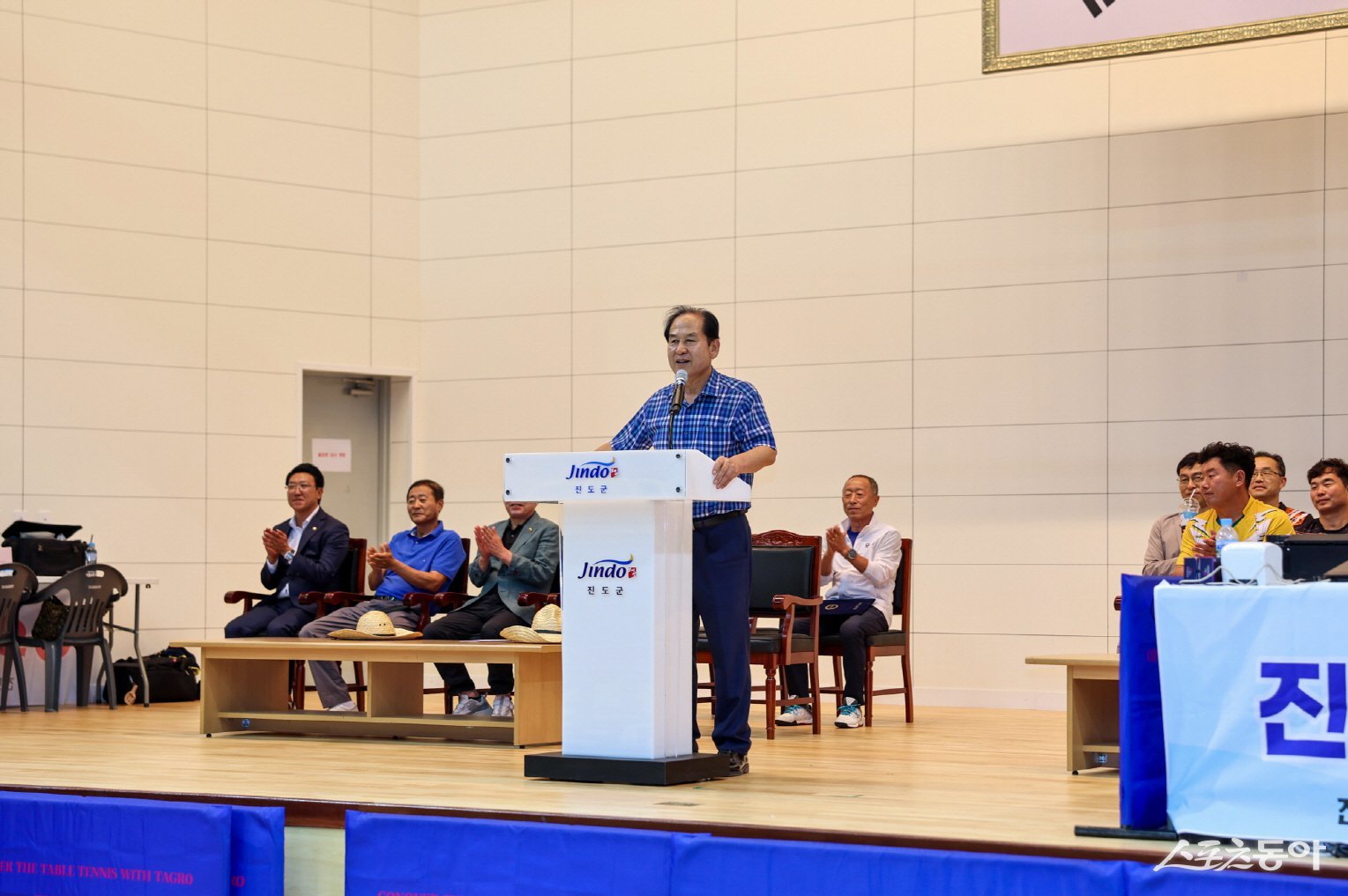 김희수 진도군수가 최근 실내체육관에서 열린 제10회 진도군수배 호남권 생활체육 탁구대회에서 인사말을 하고 있다. 사진제공=진도군