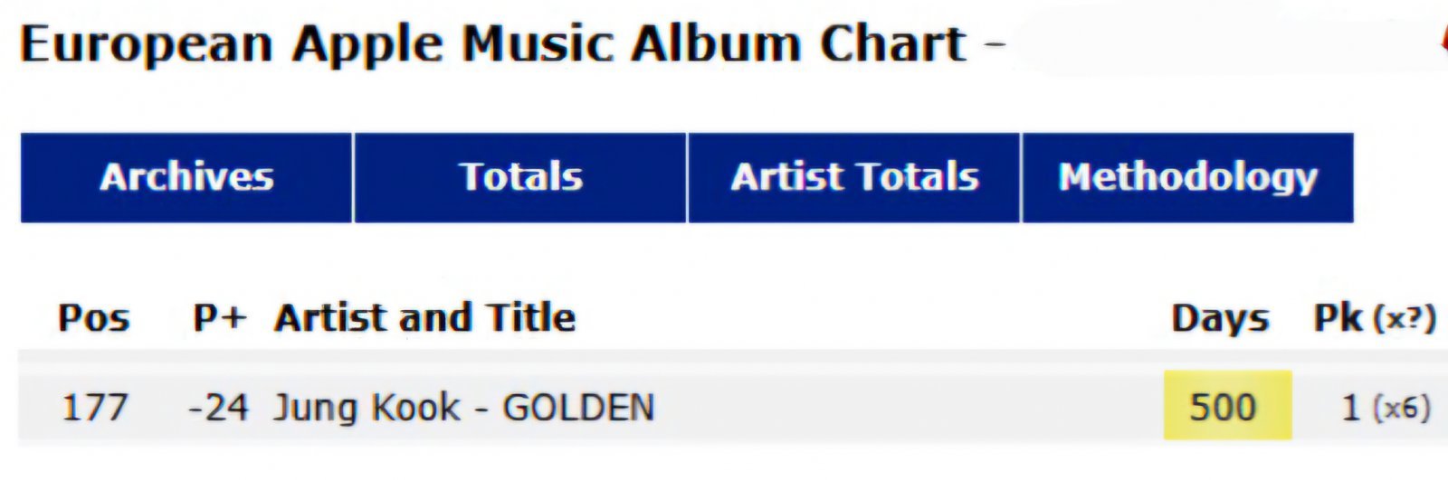 방탄소년단(BTS) 정국의 첫 솔로 앨범 ‘GOLDEN’(골든)이 마침내 K-팝 솔로 역사를 새로 썼다. 2023년 11월 발매 이후 지금까지 무려 500일 동안 애플뮤직 유러피안 앨범 차트에 진입하며 ‘초장기 집권’이라는 대기록을 달성한 것이다.