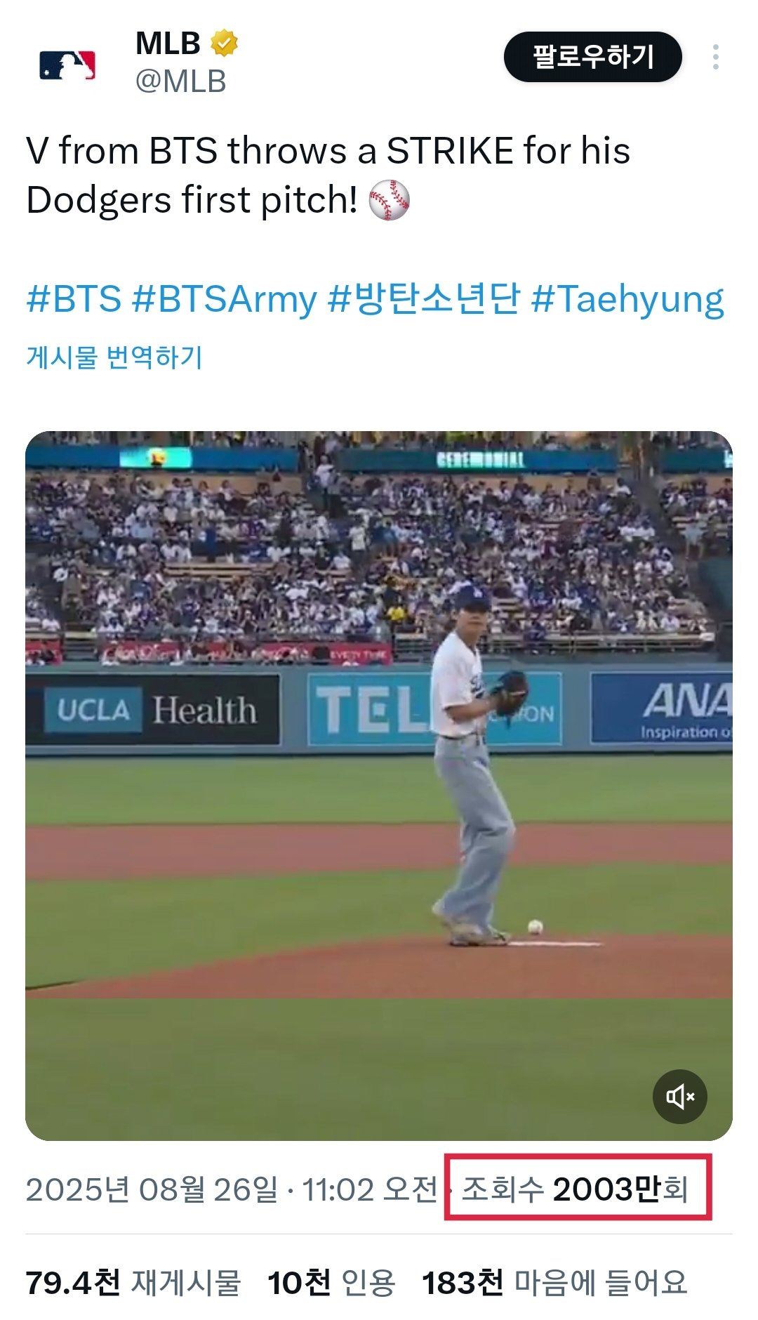 방탄소년단(BTS) 뷔의 시구 영상이 MLB 공식계정에서 2000만 조회수를 기록하며 전 세계적인 화제를 이어가고 있다.