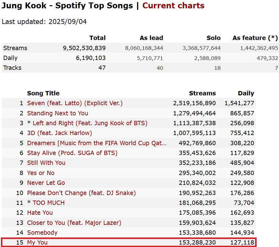 이번 성과로 정국은 스포티파이 개인 계정에서 1억5000만 스트리밍을 돌파한 곡을 통산 15곡 보유하게 됐다. ‘Seven’, ‘3D’, ‘Standing Next to You’, ‘Yes or No’, ‘Please Don’t Change’, ‘Hate You’, ‘Left and Right’, ‘Too Much’, ‘Stay Alive’, ‘Dreamers’, ‘Still With You’, ‘Never Let Go’, ‘Closer to You’, ‘Somebody’가 함께 이름을 올렸다. 여기에 방탄소년단 앨범 수록곡인 ‘Euphoria’, ‘시차’, ‘Begin’까지 더하면 총 18곡이 억대 스트리밍을 기록한 셈이다.