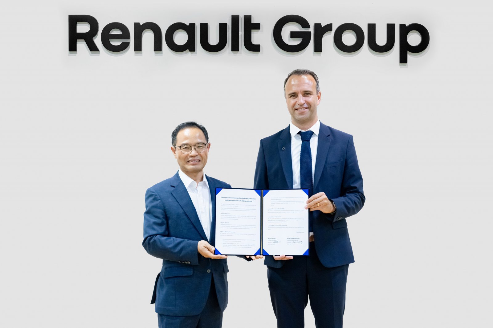 르노코리아가 5일 르노코리아 서울사무소에서 대한LPG협회와 ‘LPDi 하이브리드 자동차 양산 개발을 위한 업무협약’을 체결했다. 니콜라 파리 르노코리아 사장(오른쪽)과 이호중 대한LPG협회장. 사진제공 |르노코리아