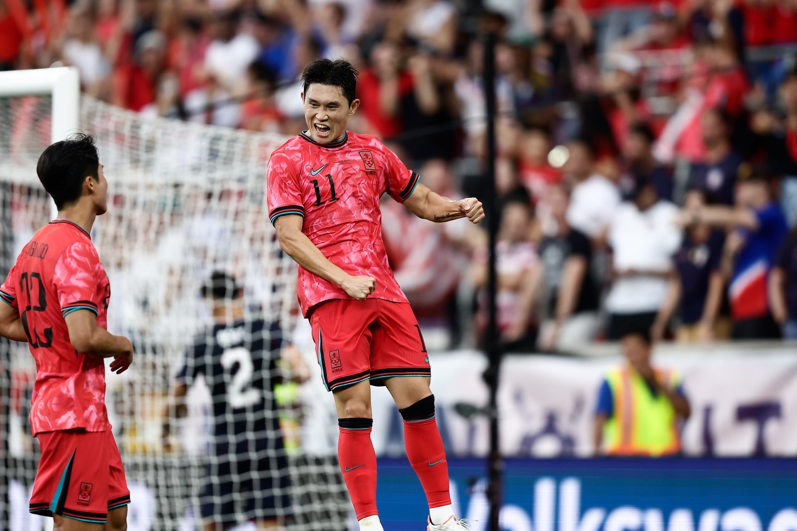 축구대표팀 이동경(11번)이 7일(한국시간) 뉴저지주 스포츠일러스트레이티드 스타디움에서 열린 미국과 평가전에서 전반 막판 쐐기골을 터트린 뒤 환호하고 있다. 사진제공|대한축구협회