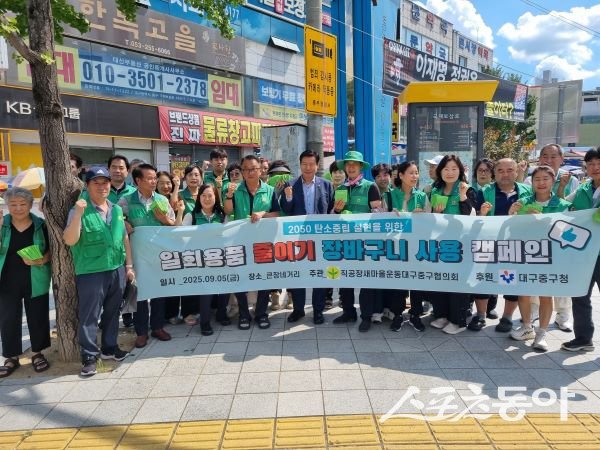 새마을 직·공장 중구협의회(회장 김부호)는 5일 대구 서문시장 큰장네거리 일대에서 ‘탄소중립 캠페인’을 열고 친환경 생활 실천을 시민들에게 독려했다.이날 캠페인에는 회원 40여 명이 참여해 쓰레기 배출 감량, 1회용품 사용 줄이기, 자원 재활용의 필요성을 알리고, 휴대용 장바구니를 나눠주며 저탄소 사회로의 전환을 호소했다.