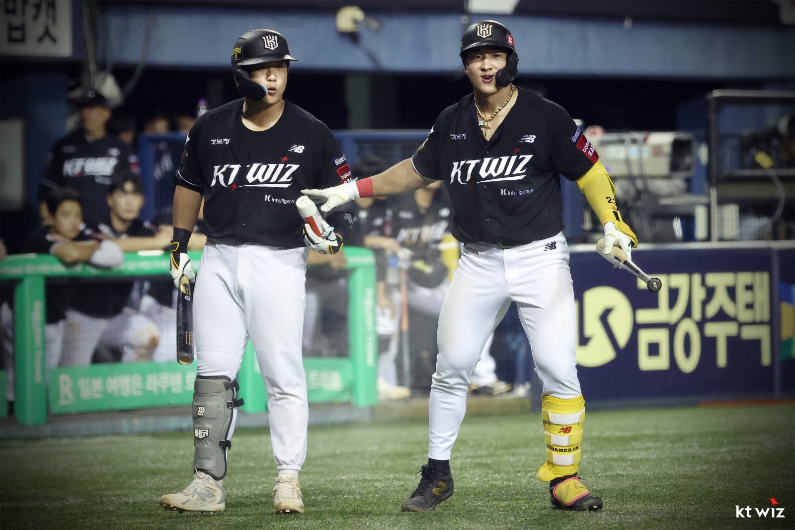 KT 간판타자 강백호(왼쪽)와 안현민이 시너지 효과를 내고 있다. 이들 2명은 타격 노하우를 공유하며 한층 견고한 타자로 성장하고 있다. 사진제공|KT 위즈