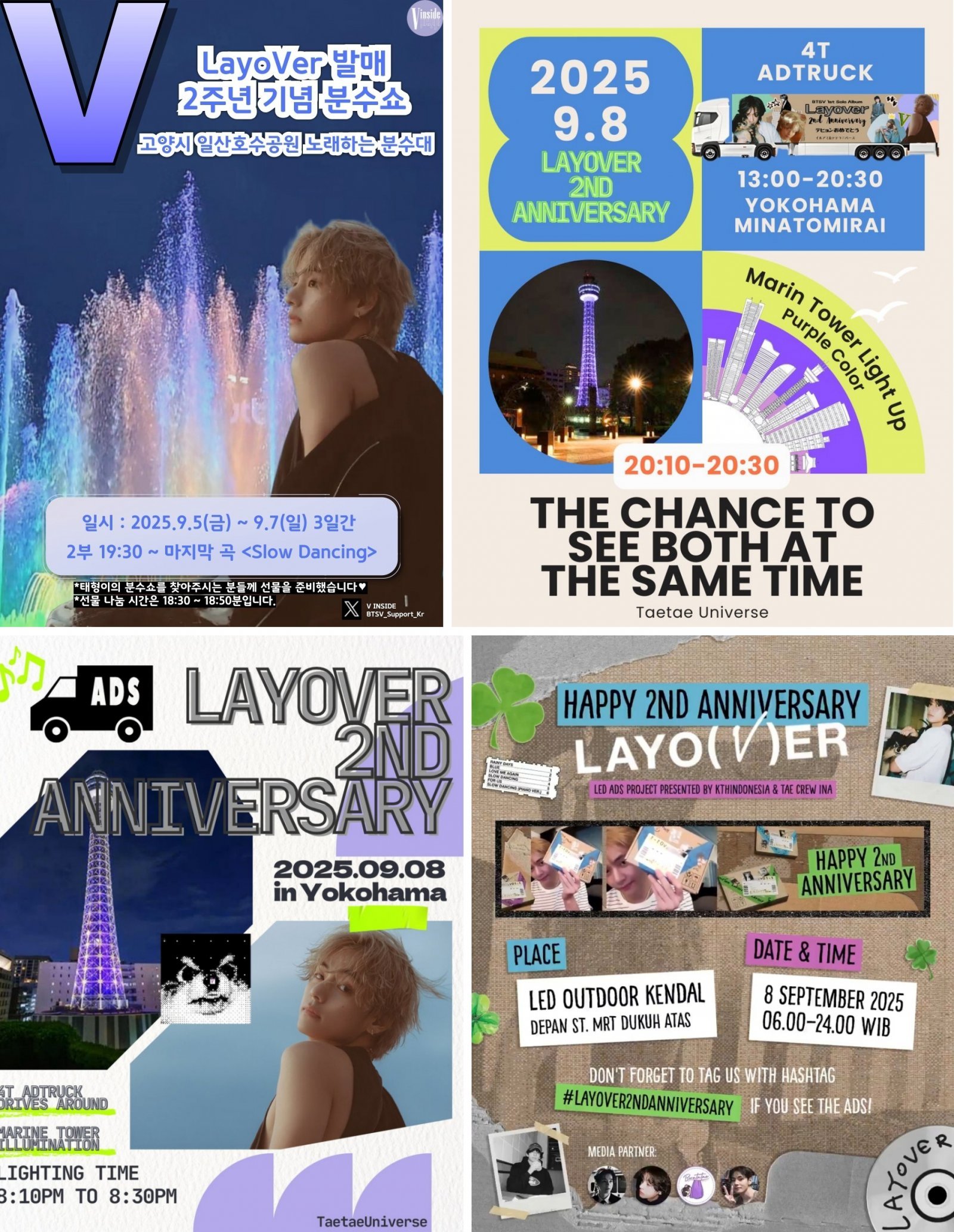 일본 팬베이스 ‘태태유니버스’(BTSV_JPN)는 요코하마 시내에 축하 영상을 실은 대형 트럭을 운행하고, 마린타워를 보랏빛 조명으로 밝혀 ‘레이오버’ 발매 2주년을 기념했다. 인도네시아의 ‘Taehyung Indonesia’는 자카르타 복합 교통 허브인 두쿠아타스역 대형 LED 광고판에 축하 영상을 송출했으며, 팬들과 함께 모임도 진행했다.