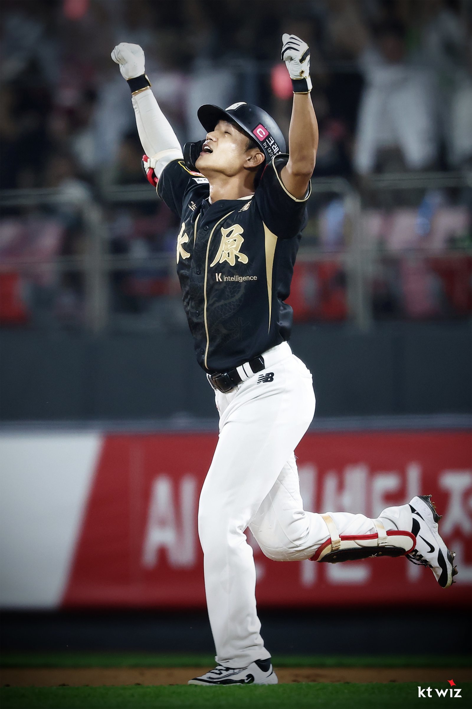 KT 안치영이 9일 수원KT위즈파크에서 열린 두산전 3회말 역전 결승 2점홈런으로 데뷔 첫 홈런을 장식한 뒤 두 팔을 번쩍 들며 기뻐하고 있다. 사진제공|KT 위즈