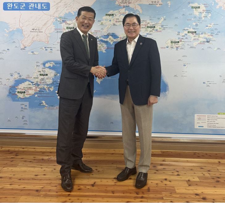 전남 완도군이 지난 4일부터 5일까지 이틀간 일본 대도시와 교류 및 협력을 확대하고자 정책 간담회, 현장 시찰 등을 진행했다. 왼쪽 홍만표 박사, 오른쪽 신우철 군수. 사진제공 ㅣ 완도군청