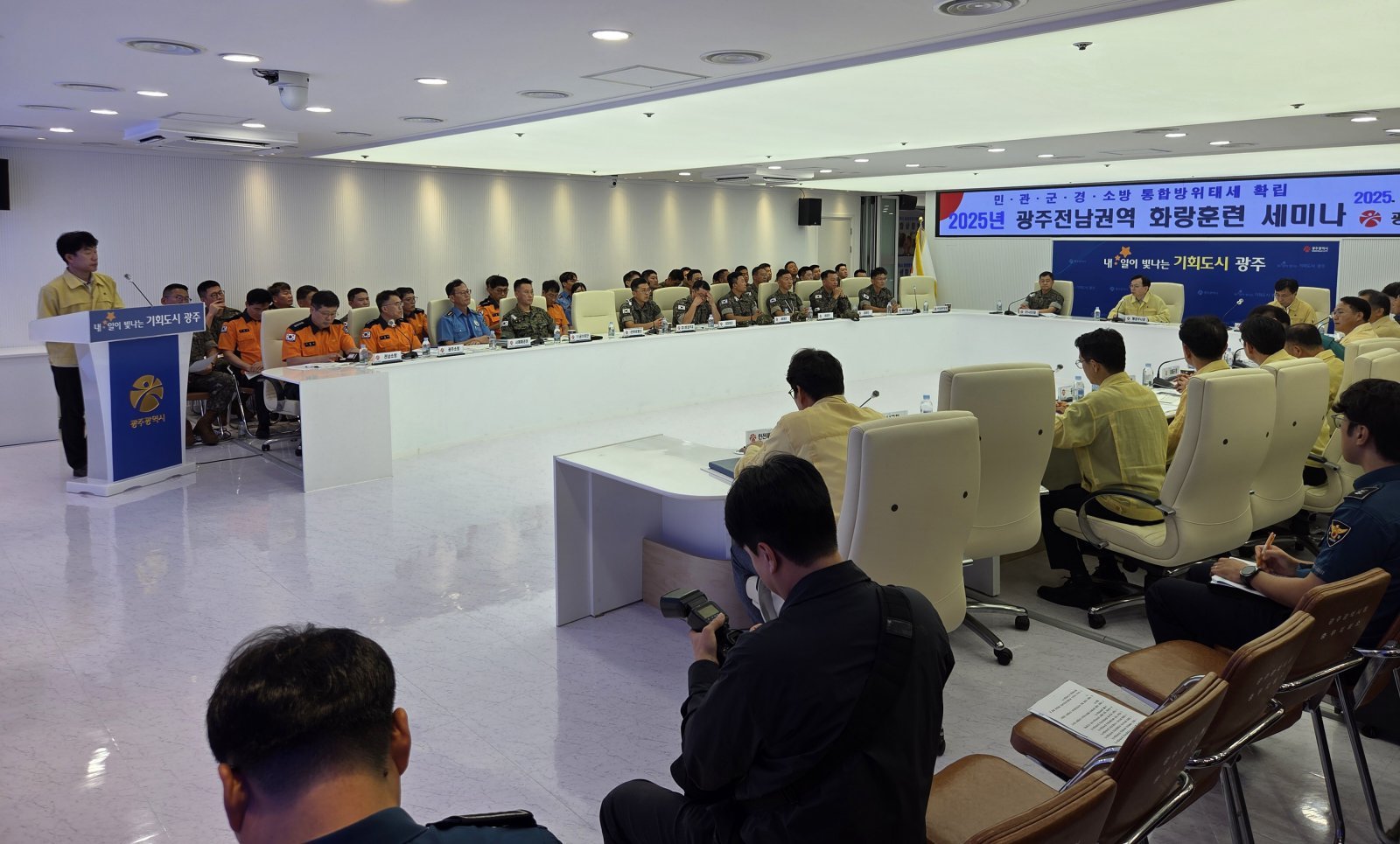 광주광역시는 전라남도, 31보병사단, 광주경찰청, 전남경찰청과 공동주관으로 10일 오전 시청 충무시설에서 ‘2025 화랑훈련 세미나’를 개최했다.