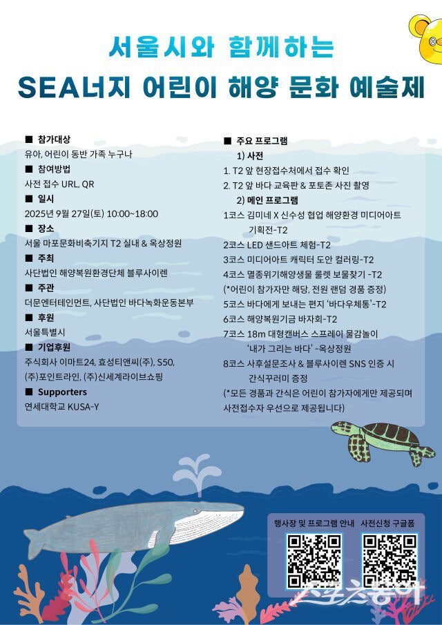 어린이들이 해양 환경의 중요성을 몸소 체험하며 즐길 수 있는 ‘서울시와 함께하는 SEA너지 어린이 해양 문화 예술제’가 27일 서울 마포문화비축기지 T2에서 개최된다.