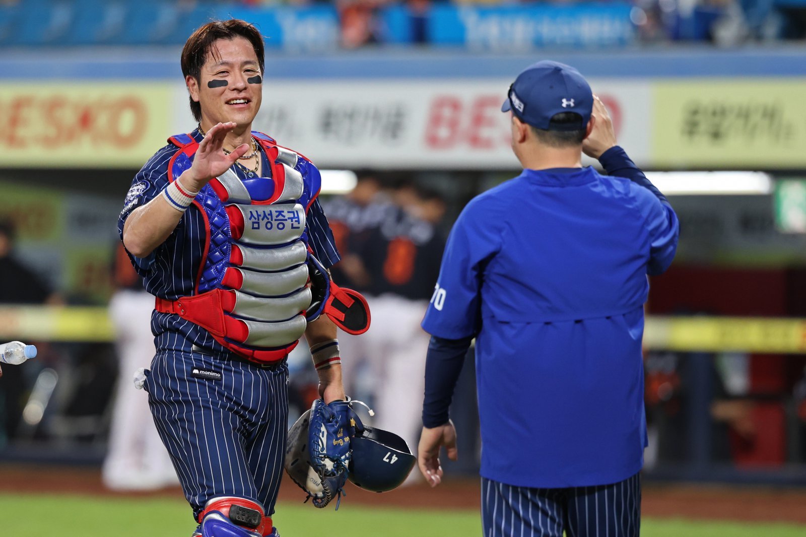 삼성 강민호는 불혹의 나이에도 팀의 확고한 주전포수로 활약 중이다. 그의 뒤를 이어야 할 젊은 포수들을 자극하며 성장을 촉진하는 것도 그의 몫이다. 7일 대구 한화전에서 승리를 거둔 뒤 박진만 감독과 하이파이브를 하는 강민호. 사진제공|삼성 라이온즈