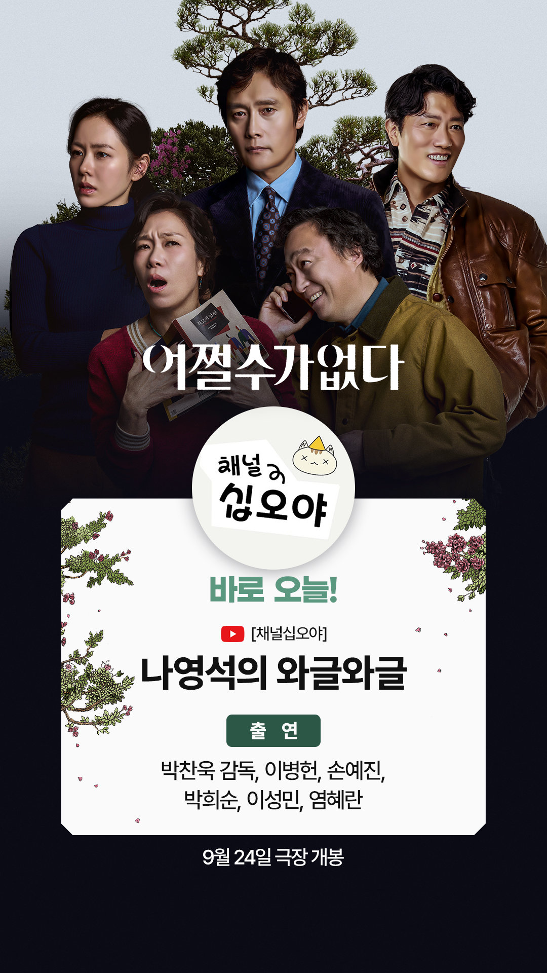 ‘어쩔수가없다’의 박찬욱 감독, 이병헌, 손예진, 박희순, 이성민, 염혜란이 9월 12일(금) 오늘 오후 6시 공개되는 유튜브 ‘채널 십오야’에 출연한다.