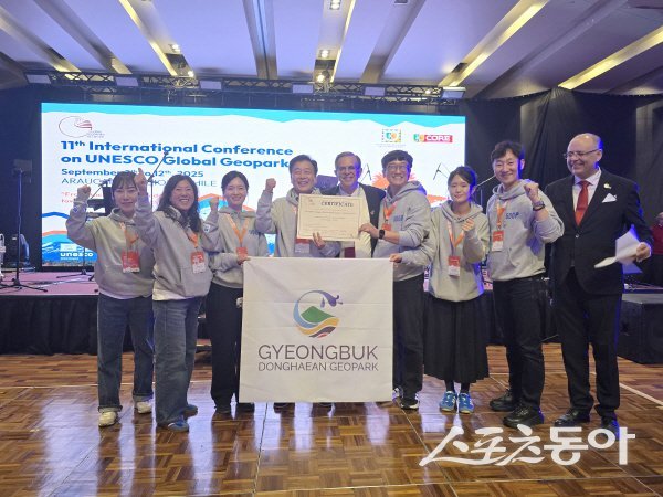 영덕군은 지난 8일부터 12일(현지 시각) 칠레 테무코에서 열린 제11회 세계지질공원네트워크(GGN) 총회에서 관내 11개 지질 명소가 포함된 경북동해안지질공원이 ‘유네스코 세계지질공원 정회원 인증서(Certificate of Membership)’를 수여받았다고 12일 밝혔다.인증서 수여식은 10일 밤(한국시간 11일 오전), 전 세계 70여 개국 1,000여 명의 대표단이 참석한 가운데 진행됐다. 이번 총회에서 경북동해안지질공원 대표단은 탐방 프로그램, 주민 참여 활동, 지질 유산 보전 사례 등을 소개해 국제사회의 주목을 받았으며, 특히 해맞이공원, 죽도산, 고래불해안, 철암산 화석 산지 등 영덕군 내 지질 명소들이 세계 무대에 부각됐다.