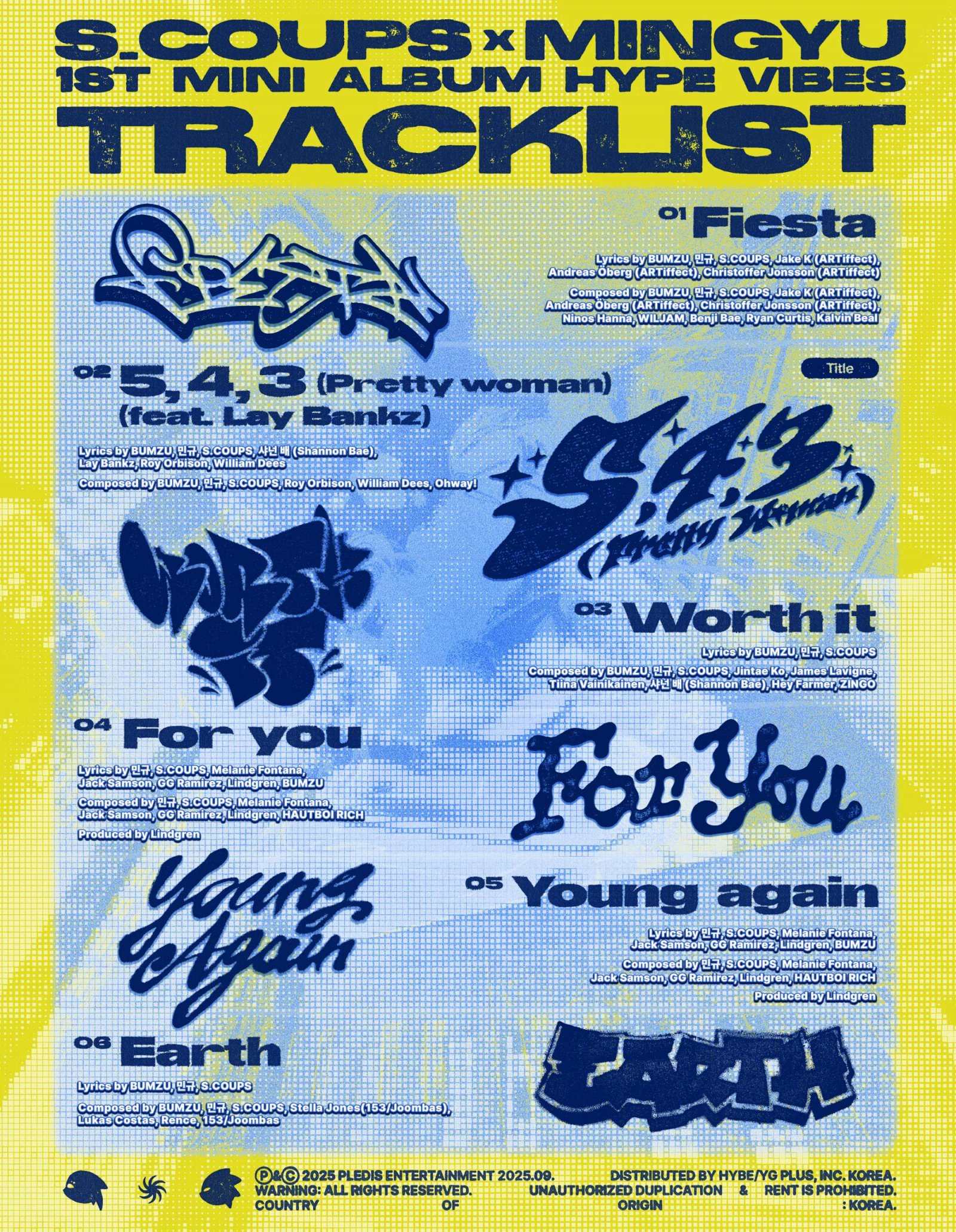 플레디스 엔터테인먼트는 지난 12일 세븐틴 공식 SNS에 에스쿱스X민규 미니 1집 ‘HYPE VIBES’의 트랙리스트를 게재했다. 이에 따르면 신보에는 타이틀곡 ‘5, 4, 3 (Pretty woman) (feat. Lay Bankz)’를 포함해 ‘Fiesta’, ‘Worth it’, ‘For you’, ‘Young again’, ‘Earth’ 총 6곡이 실린다.