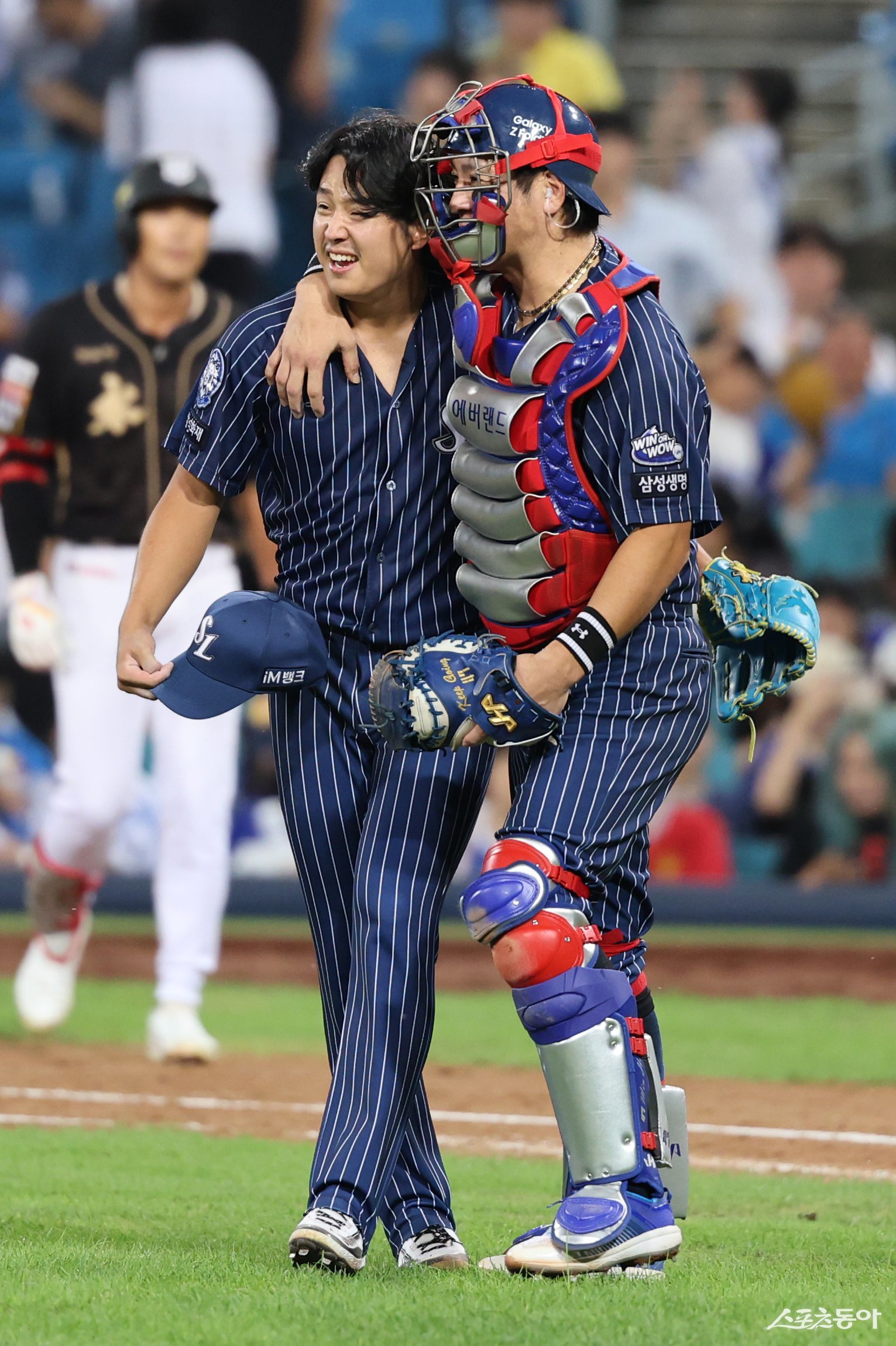 삼성 양창섭(왼쪽)이 14일 대구삼성라이온즈파크에서 열린 KT와 홈경기에서 6.2이닝 무피안타 1사구 5탈삼진 무실점 역투로 팀의 6-2 승리를 이끈 뒤, 배터리로 호흡을 맞춘 포수 강민호와 기쁨을 나누고 있다. 사진제공|삼성 라이온즈