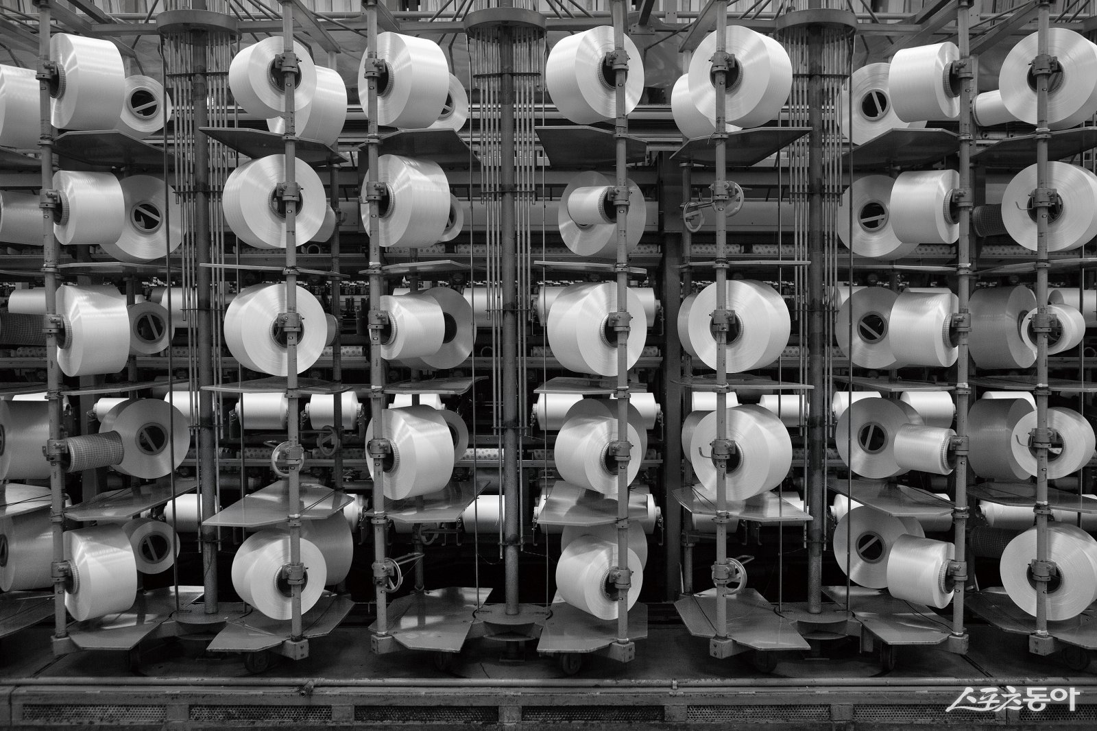 효성티앤씨 구미공장에서 생산되고 있는 친환경 섬유 리젠 폴리에스터. 사진제공|효성티앤씨