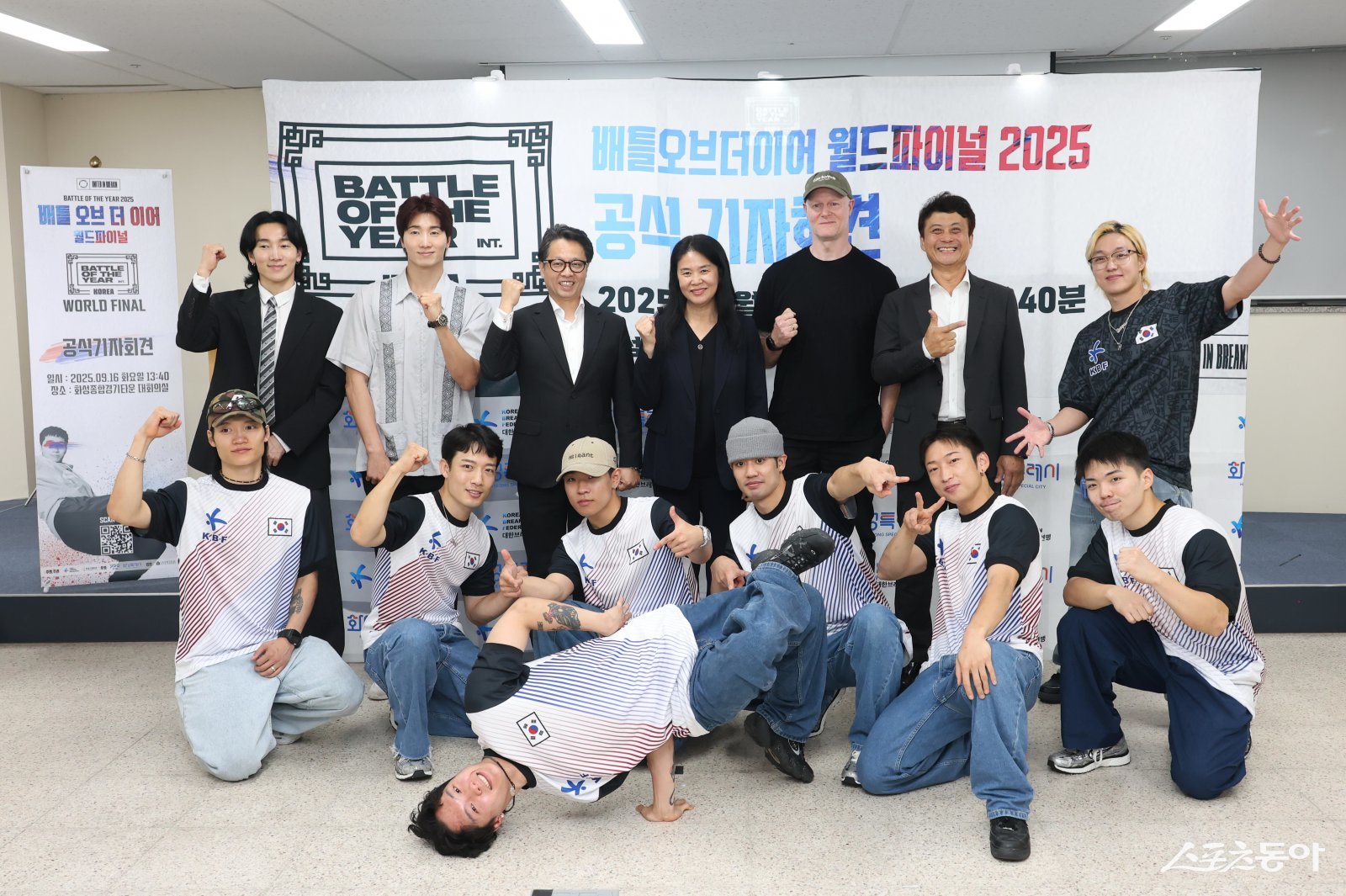 지난 16일 배틀오브더이어 월드파이널 미디어데이에서 주요 내빈들과 브레이킹 아티스트들이 기념 촬영하고 있다. 사진제공|화성시