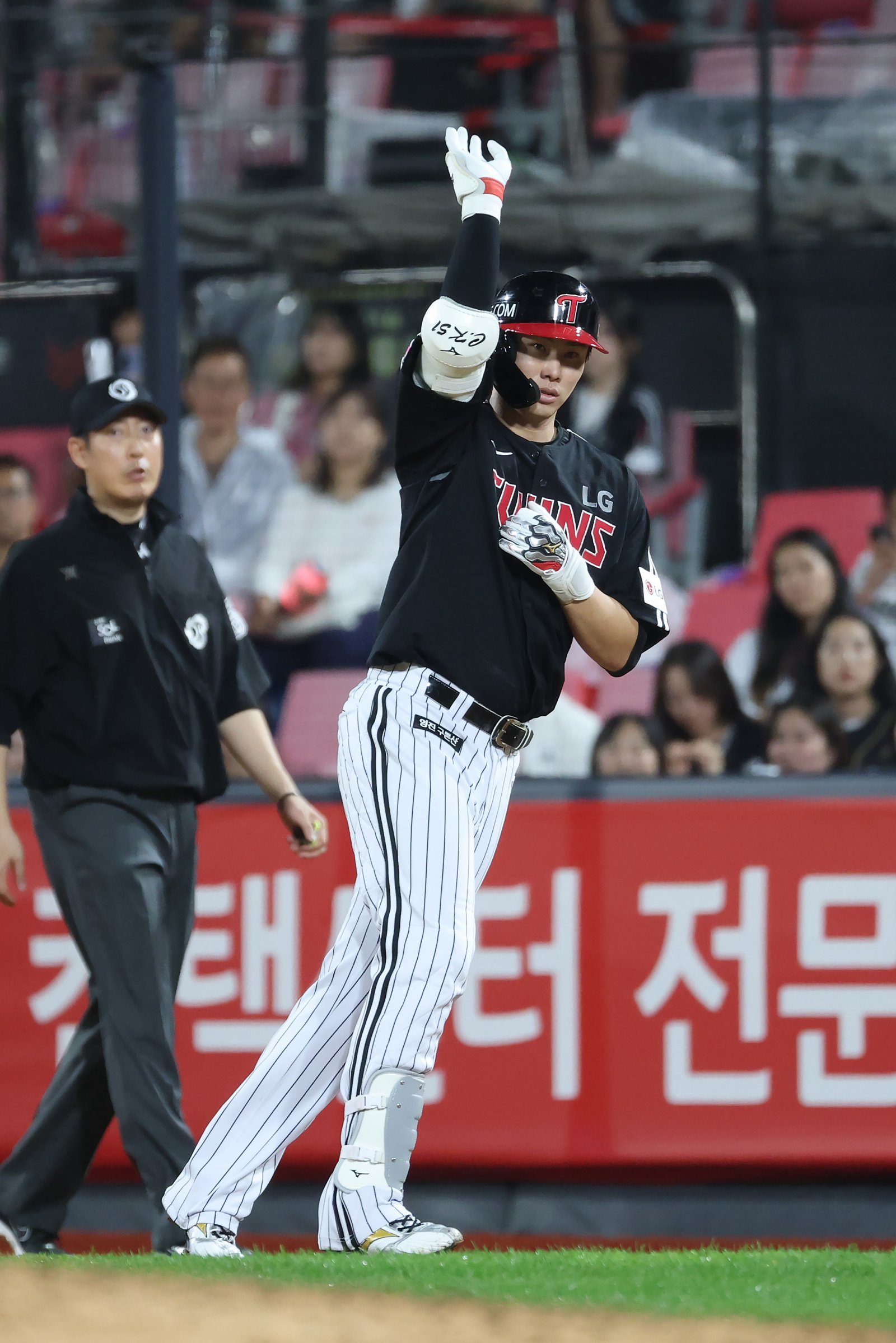 LG 홍창기(오른쪽)가 16일 수원 KT전에 대타로 교체출전해 좌전안타를 날린 뒤 덕아웃을 바라보며 세리머니를 하고 있다. 홍창기는 부상 복귀 후 대타로만 타율 10할을 기록했다. 17일부터는 지명타자로 선발 라인업에 복귀해 LG 타선에 힘을 보탤 예정이다. 사진제공|LG 트윈스