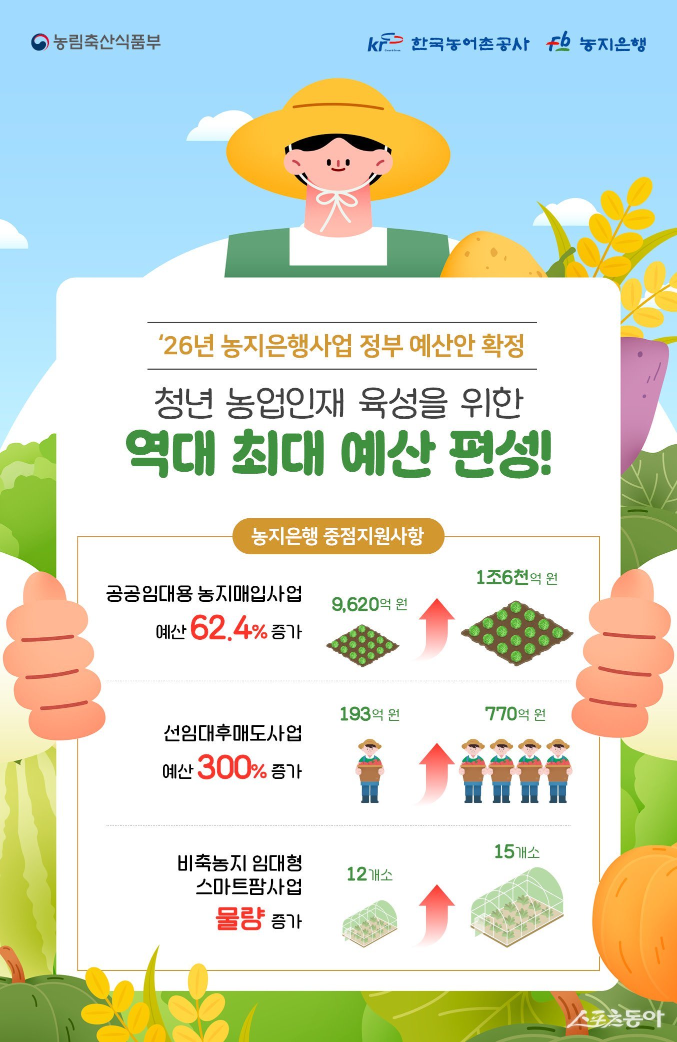 한국농어촌공사(사장 김인중)가 시행 중인 농지은행사업의 2026년 정부 예산안이 확정됐다. 총 2조 4천억 원으로 역대 최대 규모다.