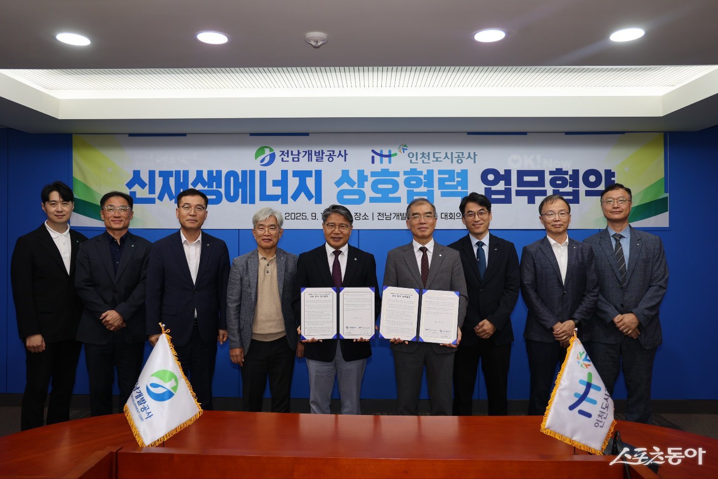 iH(인천도시공사)는 지난 16일 전남개발공사와 ‘신재생에너지 정책 기여 및 지역상생을 위한 상호협력 업무협약’을 체결했다고 밝혔다. 사진제공|인천도시공사