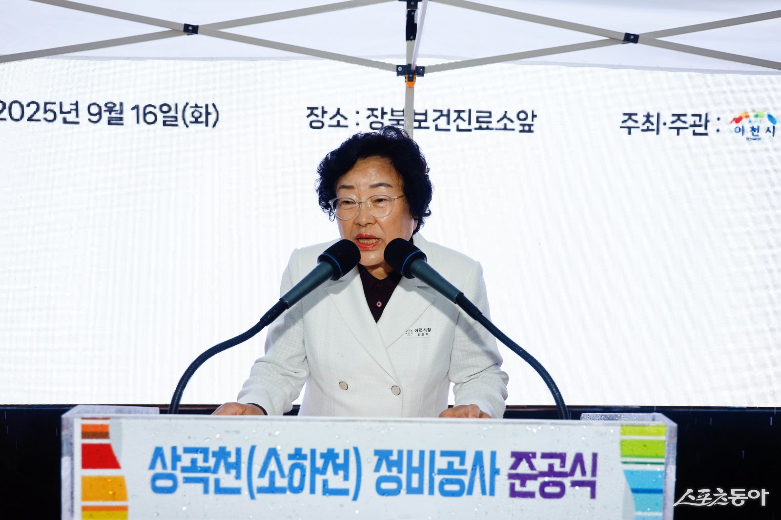 이천시(시장 김경희)가 추진한 상곡천(소하천) 정비사업이 약 2년간의 공사를 마무리하고, 9월 16일 준공식을 끝으로 공식 완료됐다(김경희 시장 축사 모습). 사진제공|이천시