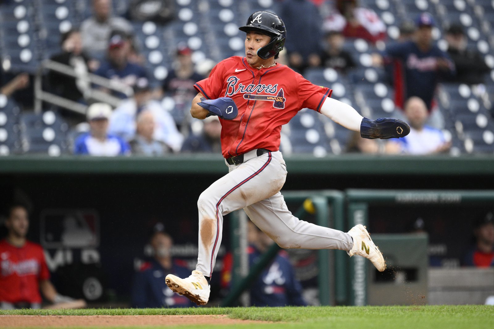 애틀랜타 김하성이 17일(한국시간) 워싱턴과 더블헤더 제1경기에서 4타수 2안타 2득점, 제2경기에서 2타수 1안타 1득점을 올리며 팀의 4연승에 일조했다. 더블헤더 제1경기 8회초 비달 브루얀의 안타 때 홈을 파고드는 김하성. 워싱턴DC|AP뉴시스