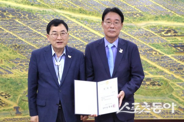 주낙영 경주시장(왼쪽)이 김진태 신임 시설관리공단 이사장에게 임명장을 수여하고 있다. 사진제공 ㅣ 경주시