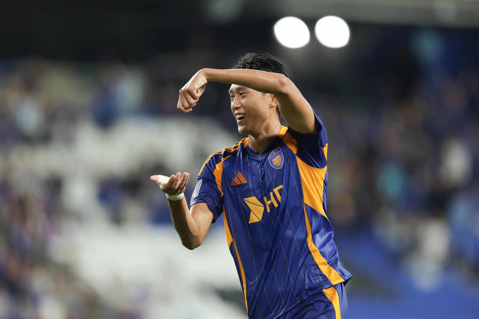 울산 허율이 17일 울산문수경기장에서 열린 청두와 ACLE 리그 스테이지 홈경기에서 후반 추가시간 역전골을 성공시킨 뒤 활짝 웃고 있다. 사진제공|한국프로축구연맹