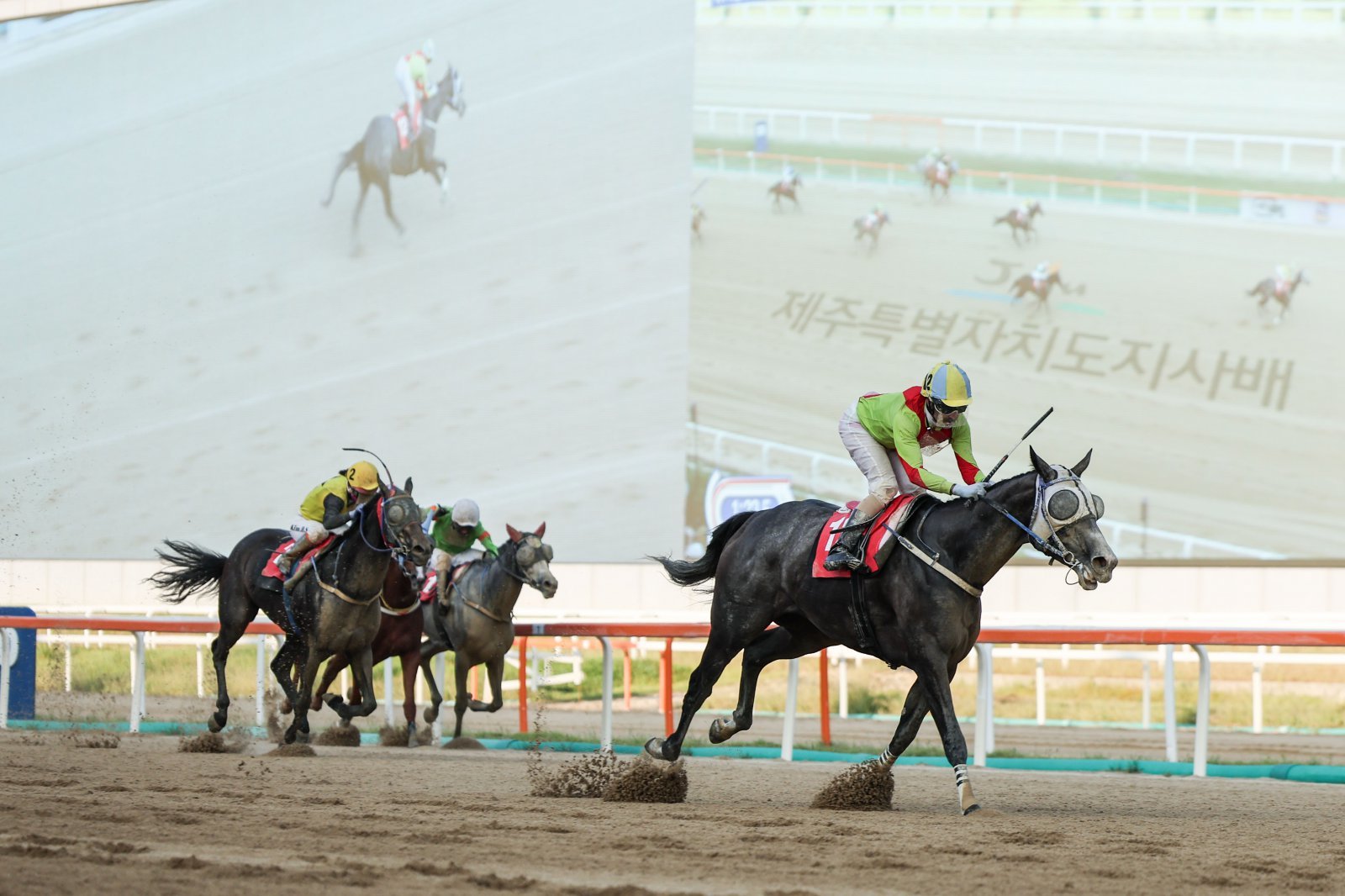 즐거운여정(오른쪽)은 21일 렛츠런파크에서 열리는 ‘제12회 제주특별자치도지사배’에서 사상 첫 3년 연속 우승에 도전한다. 사진은 지난해 이 대회에서 결승선을 향해 질주하고 있는 즐거운여정. 사진제공 | 한국마사회