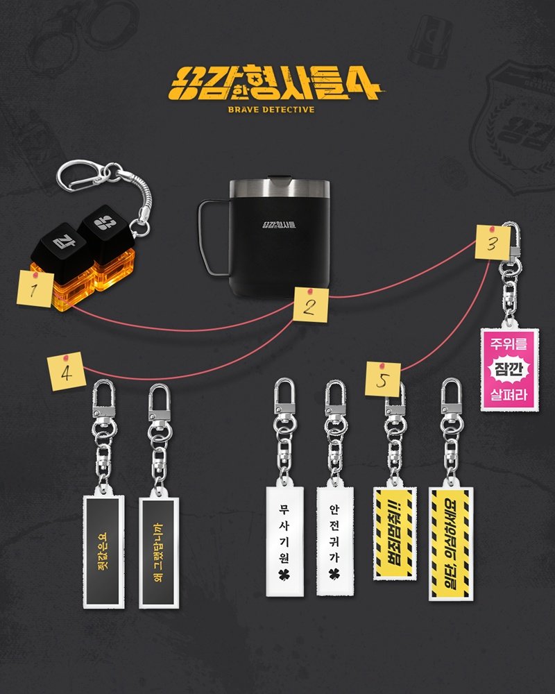 굿즈 품목은 ‘용감’ 키워드가 새겨진 키캡 키링 2종, ‘용감한 형사들’의 시그니처 로고가 각인된 스탠리 텀블러 컵, “왜 그랬답니까”, “죗값은요”, “범죄 멈춰!”, “일단 의심하세요”, “무사기원”, “안전 귀가”, “잠깐 주위를 살펴라” 등 범죄 예방 문구 및 ‘용감한 형사들’의 대표 문구가 담긴 키링 7종으로 구성됐다.