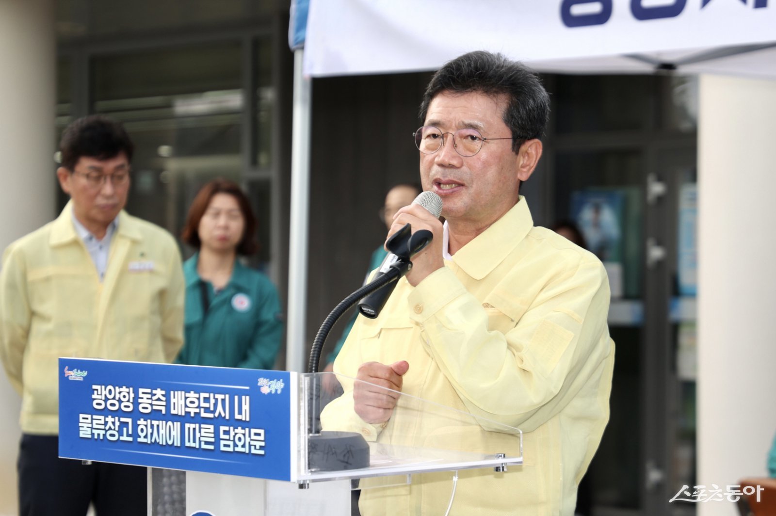 정인화 광양시장이 18일 광양항 동측배후단지 내 물류창고 화재 발생에 따른 담화문을 발표했다.