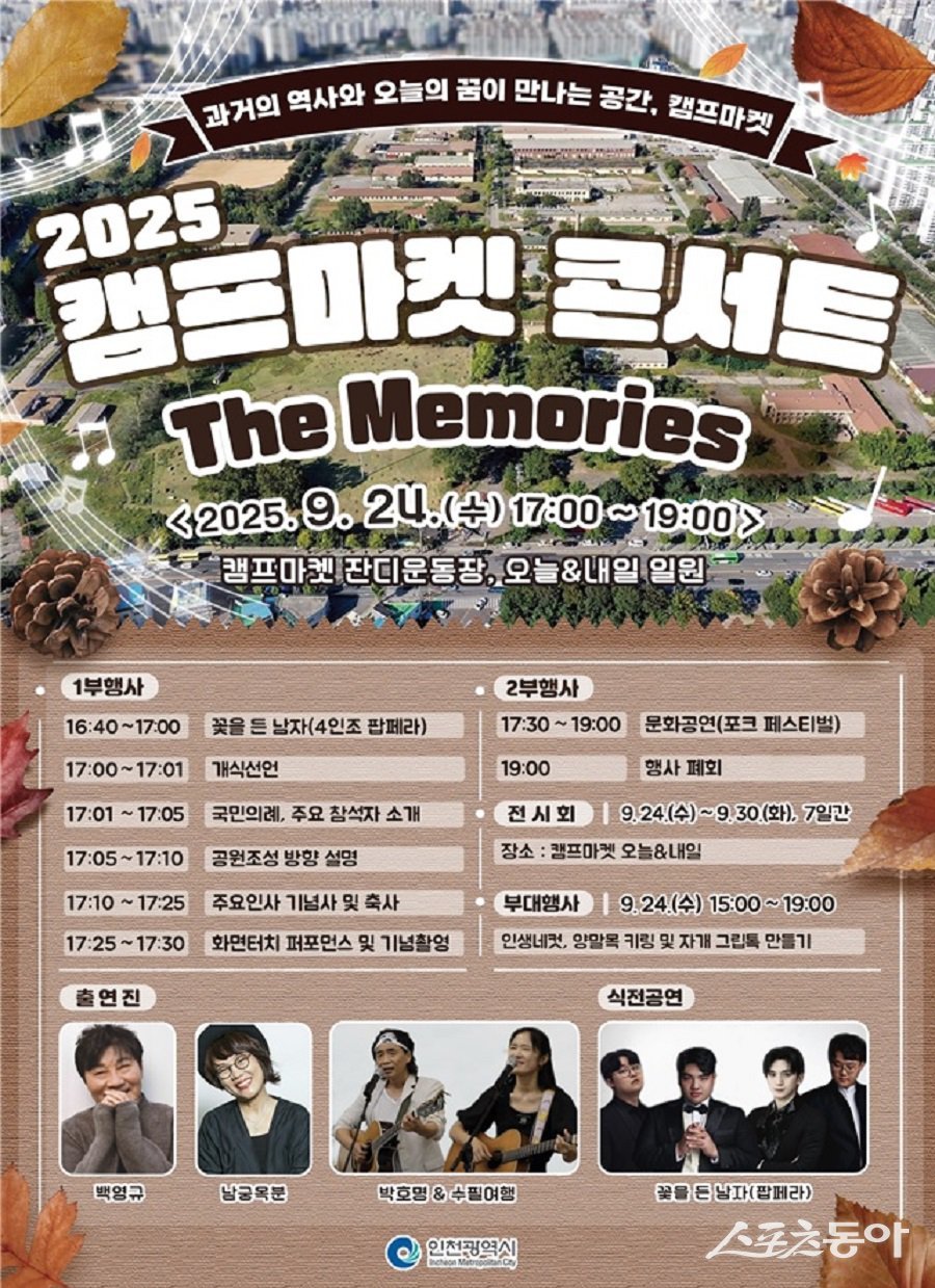 인천광역시(시장 유정복)는 오는 9월 24일 오후 5시, 부평 캠프마켓 개방공간 잔디운동장에서 ‘2025 캠프마켓 콘서트 The Memories’를 개최한다(포스터). 사진제공|인천시