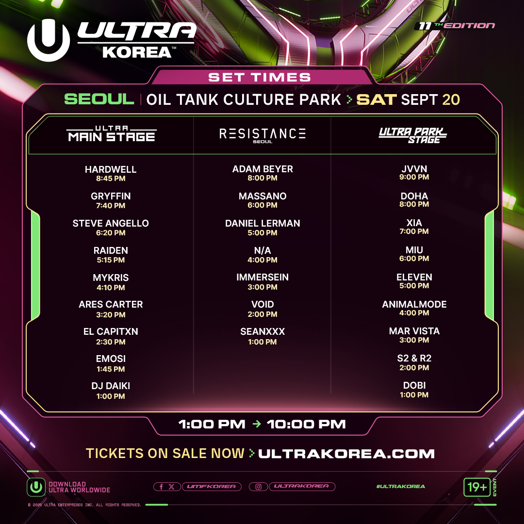 무대 라인업은 화려하다. 8년 만에 울트라 코리아 무대에 서는 하드웰(Hardwell), 스티브 안젤로(Steve Angello), 아담 베이어(Adam Beyer), 그리핀(Gryffin), 레이든(Raiden), 마사노(Massano)가 출격한다. 테크노, 빅룸 등 강렬한 사운드가 쉴 새 없이 쏟아질 예정이다. 아직 공개되지 않은 국내 아티스트의 ‘서프라이즈 무대’도 팬들의 기대감을 끌어올린다.