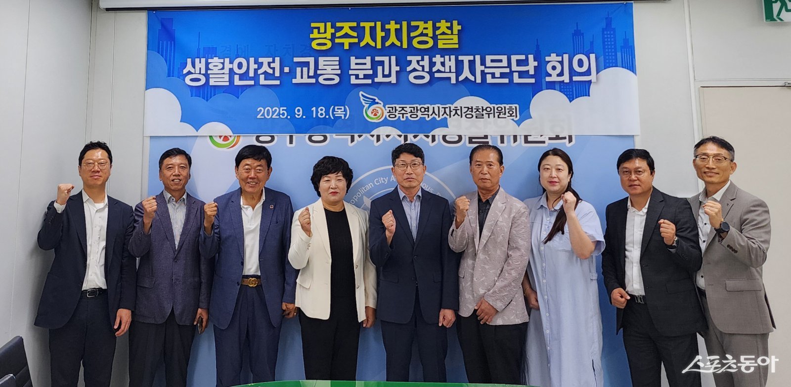 광주자치경찰위원회가 지난 18일 시청 자치경찰위원회 회의실에서 ‘생활안전·교통 분과 정책자문단 간담회’를 열고 기념촬영을 하고 있다. 사진제공=광주자치경찰