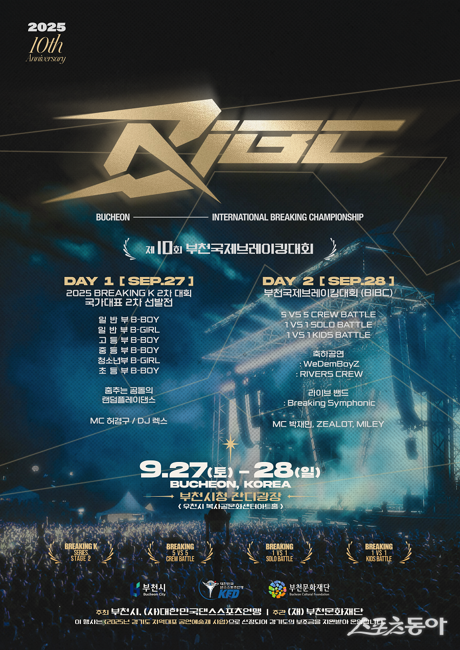 부천문화재단은 오는 9월 27일부터 28일까지 이틀간 시청 잔디광장에서 ‘제10회 부천국제브레이킹대회(BIBC)’를 개최한다고 밝혔다. 올해로 10회를 맞은 BIBC는 부천을 국제 브레이킹 대회의 중심지로 자리매김시키는 대표 축제로, 공식 엠블럼 제작 등을 통해 대회의 상징성과 위상을 강화했다.