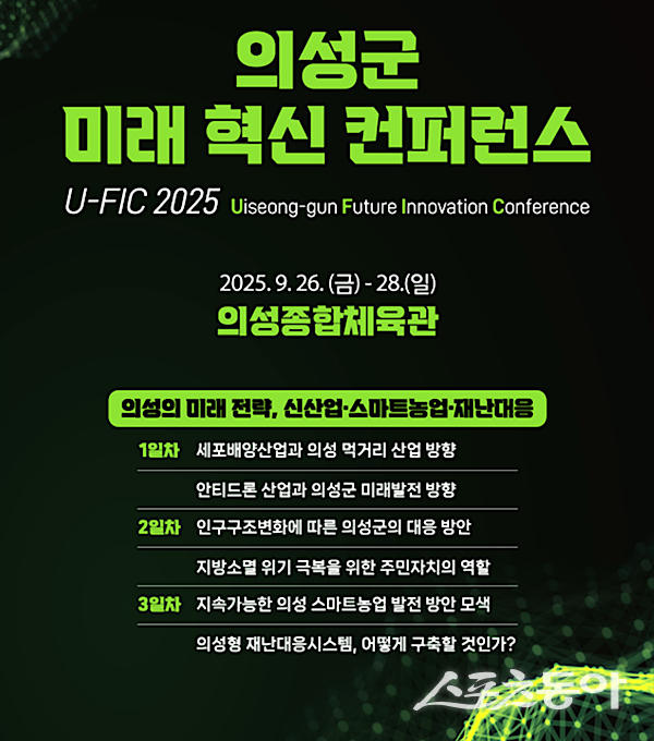 의성군은 오는 26일부터 28일까지 의성종합체육관에서 ‘의성군 미래 혁신 컨퍼런스(U-FIC)’를 연다.26~28일 의성종합체육관에서 진행