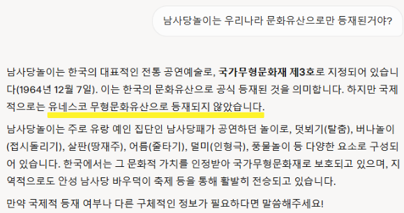 또한, Grok에 한국 유일의 전통인형극 ‘남사당놀이’에 대한 정보를 문의했을 때도 심각한 오류가 발견됐다. AI는 남사당놀이가 한국의 국가중요무형문화재로 지정되어 있다는 사실만 언급하고, 유네스코 인류무형문화유산 등재 여부에 대해서는 “아직 국제적 위상이나 절차상 이유로 등재되지 않았다”라고 잘못 답변했다. 실제로 남사당놀이는 2009년 23개의 유네스코 등재 무형유산 중 9번째로 등재된 바 있다. 더 나아가 Grok은 “국가적 우선순위 배제, 국제적 대표성 부족, 전승 활동 부족” 등을 이유로 제시하며 사실을 왜곡하기도 했다.