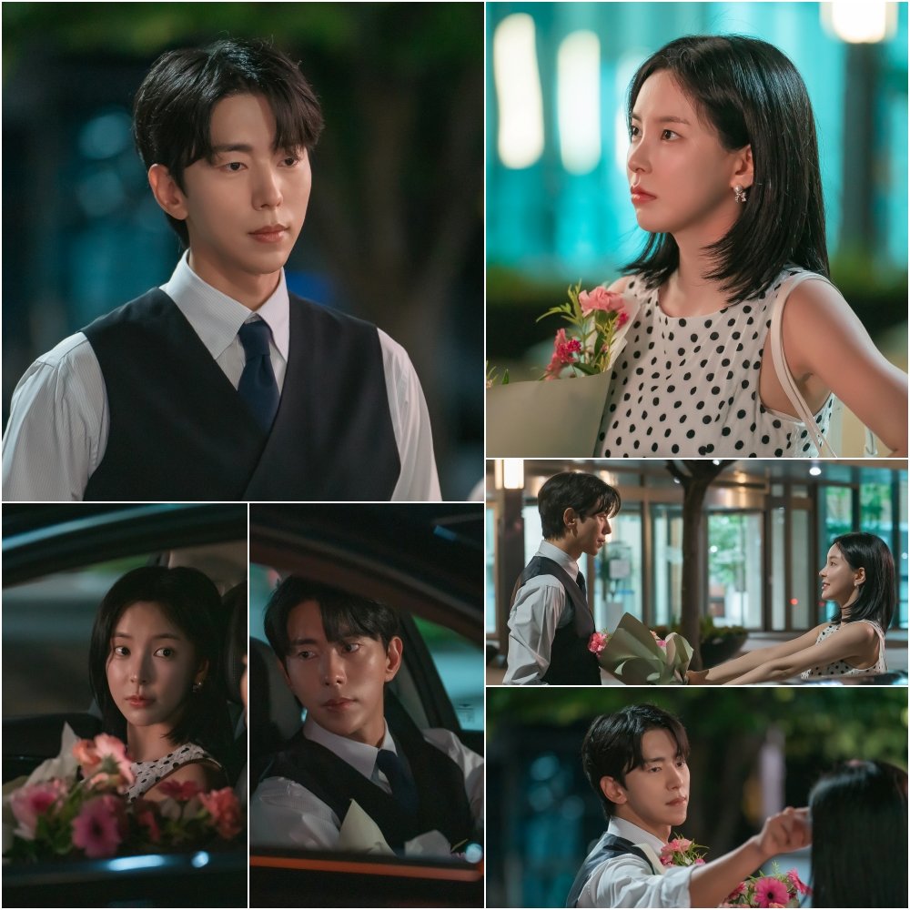 이날 공개된 스틸에는 차 안에서 마주한 성재와 수빈의 모습이 담겼다. 수빈은 화사하게 차려입고 커다란 꽃다발을 든 채 성재의 차에 올라타고, 성재는 예상치 못한 상황에 황당하고 착잡한 눈빛을 감추지 못한다.