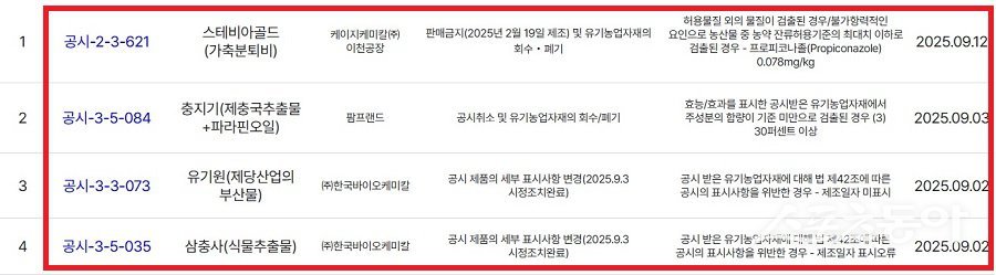 또 ㈜한국바이오케미칼 유기농업자재 ‘유기원’, ‘삼충사’, ‘유기원삼진아웃’, ‘유기원선충119’ 등 4종 제품→ 세부 표시사항 변경 조치 (제조일자 미표시 또는 표시오류, 2025년 9월 3일 시정 완료), 향토영농조합법인 담양공장 ‘풍성한골드(혼합유박)’에서 허용물질 외 성분 검출→ 판매금지 및 회수·폐기(2025년 5월 27일 생산분) 등이다.