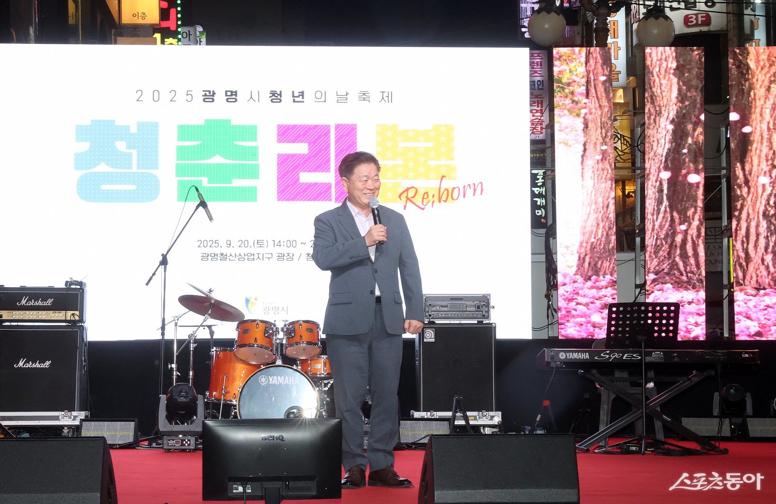 박승원 광명시장이 지난 20일 철산상업지구 광장에서 열린 ‘2025 청년의 날 축제 청춘:Re;born(리본)’에 참석해 인사말을 하고 있다. 사진제공|광명시