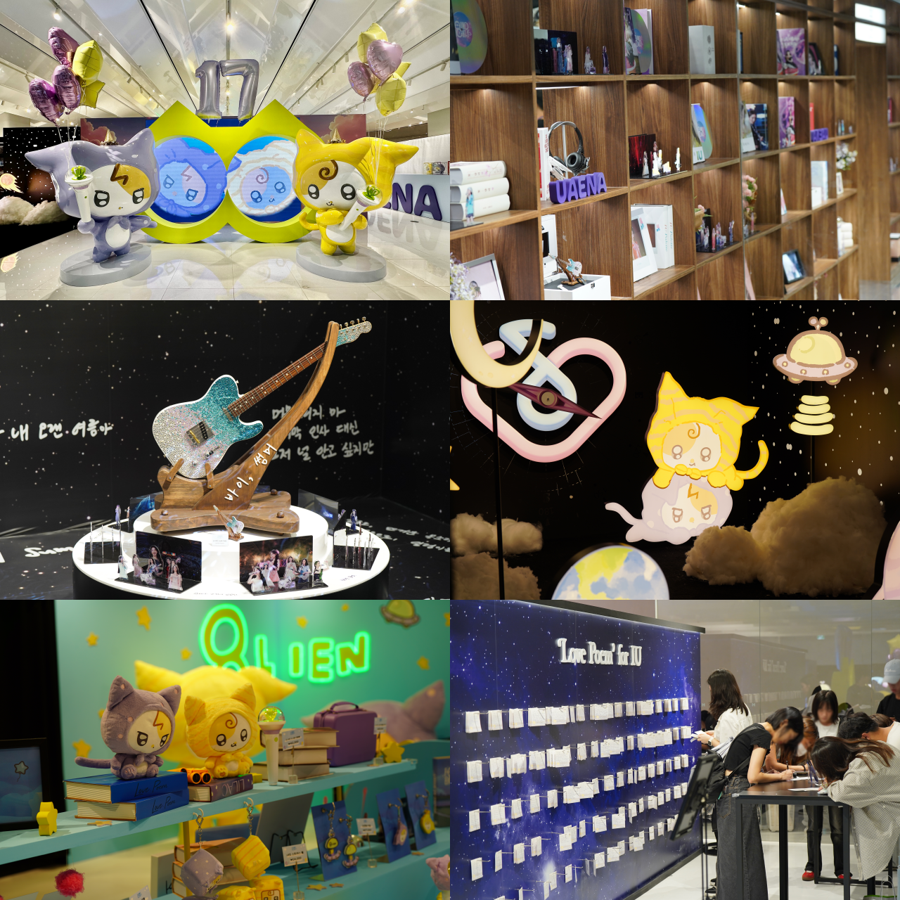 공간은 다채로운 테마로 꾸며졌다. ‘메인 포토존’에는 ‘에일이언’ 조형물과 숫자 8을 형상화한 망원경 오브제가 설치돼 애니메이션을 감상할 수 있었다. ‘우리의 세계 존’은 아이유와 유애나의 연결을 우주적 감각으로 풀어냈다. 또한 역대 앨범 커버와 관련 소품들이 전시된 ‘인피니티 서재 존’, 지난해 콘서트에서 사용한 기타와 손글씨 가사가 은하수처럼 펼쳐진 ‘바이, 썸머 존’ 등은 팬들에게 특별한 감동을 안겼다.